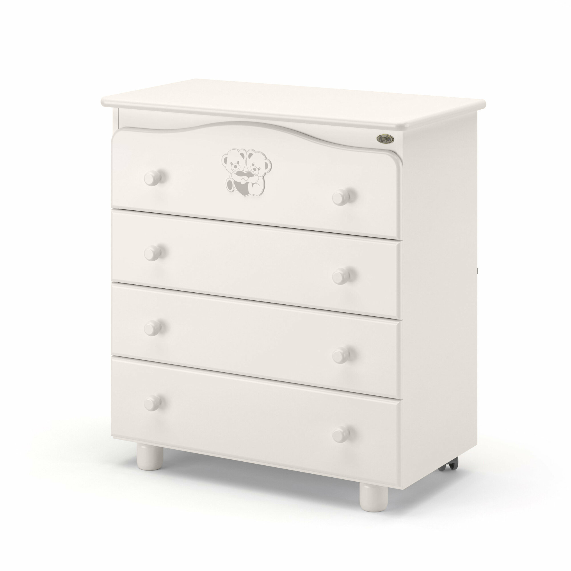 • четыре вместительных ящика с круглыми ручками и привлекательным изображением медвежат с сердечком на верхней секции, предназначенные для хранения детской одежды, принадлежностей по уходу за ребенком, игрушек и т.п.;
