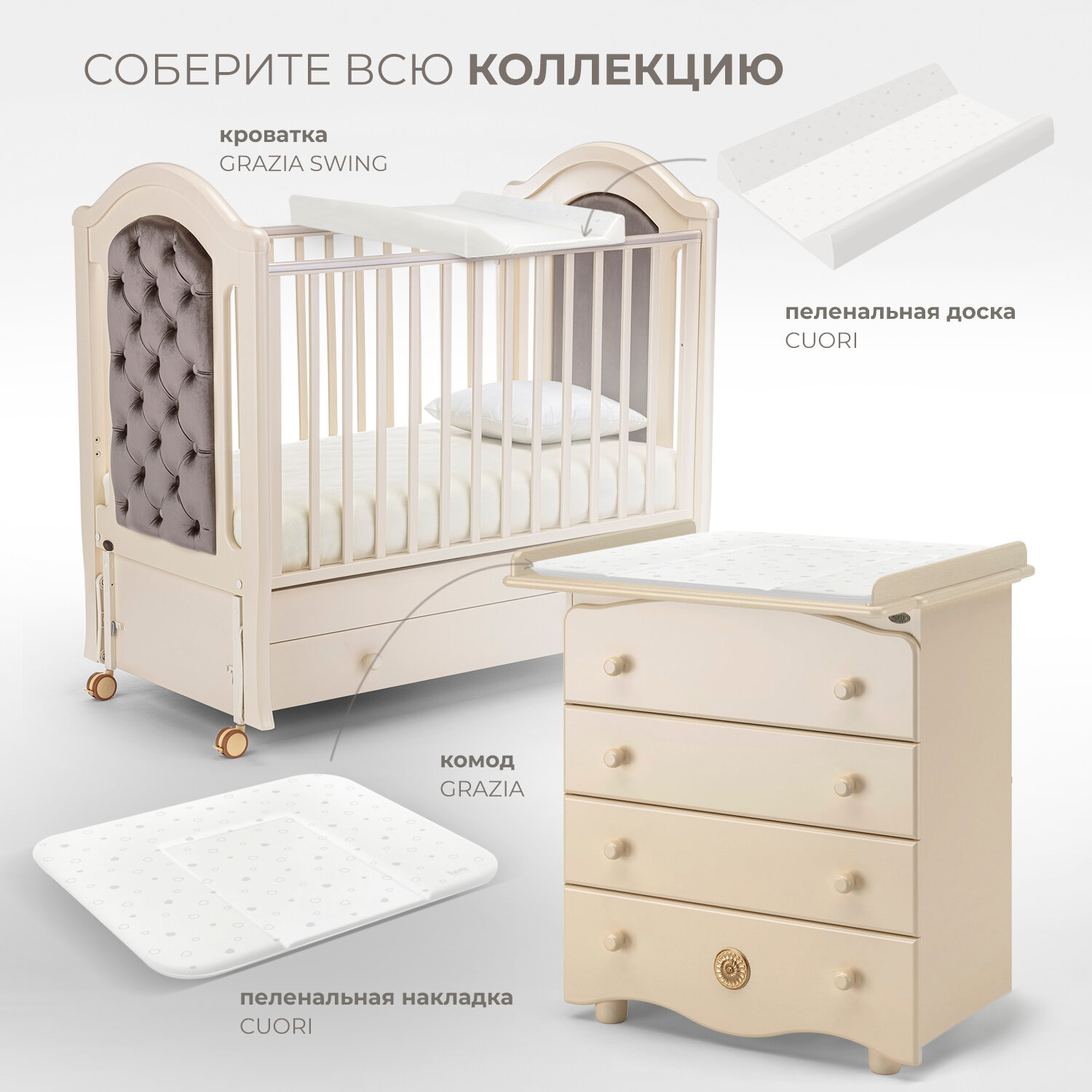Эти симпатичные предметы мебели, выполненные в едином стиле с кроватками той же серии, обладают особым шармом и элегантностью. Кроме того, они имеют следующие особенности: