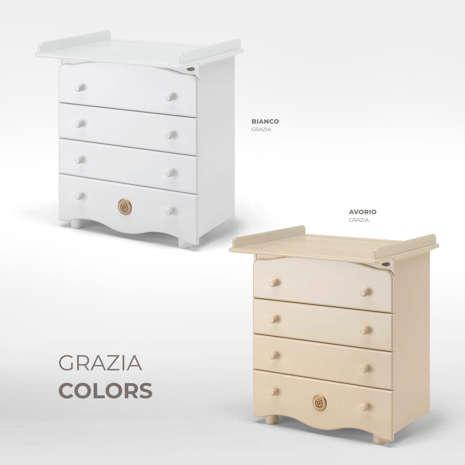 Красивые, удобные и практичные итальянские детские комоды с пеленальной доской Nuovita Grazia, входящие в новую коллекцию 2018 года, произведены из древесины бука ценных пород с применением ЛДСП и ХДФ. Изделия имеют безупречно отшлифованную поверхность, окрашенную нетоксичными красками белого цвета, классического темного ореха или цвета слоновой кости. Благодаря универсальному окрасу, они прекрасно вписываются в интерьер любой детской.
