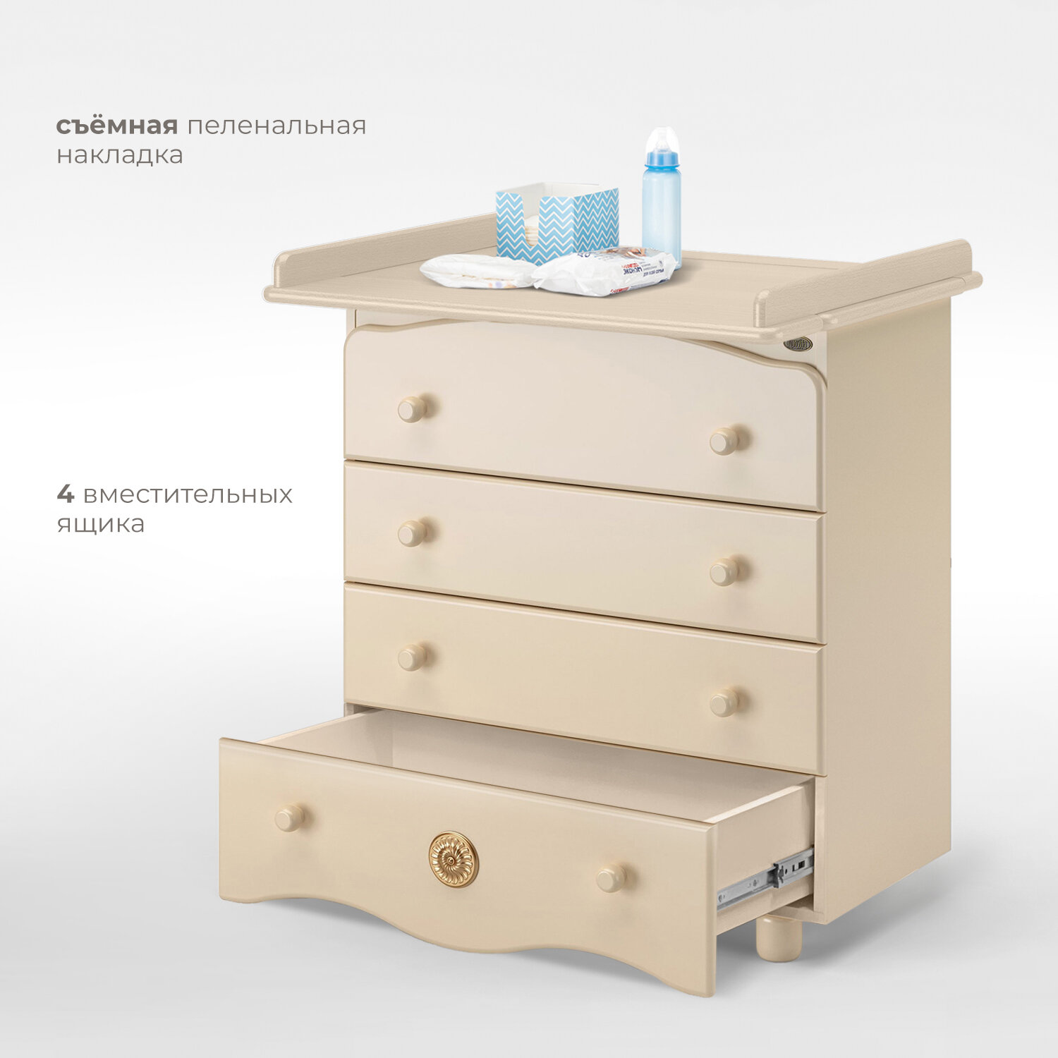 • четыре ящика с эргономичными ручками, вмещающие все необходимые личные вещи малыша, аксессуары и игрушки;