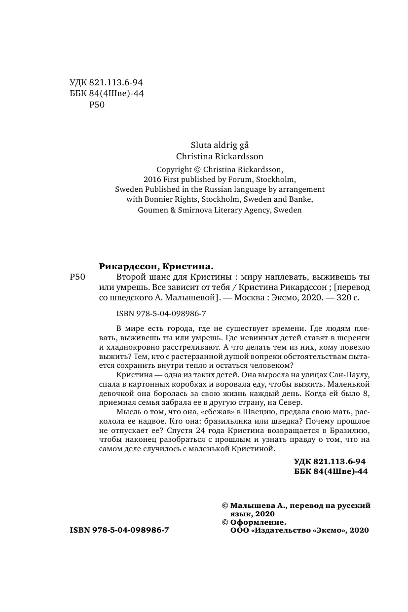 Второй шанс для Кристины. Миру наплевать выживешь ты или умрешь. Все зависит от тебя (Рикардссон Кристина); ООО "Издательство "Эксмо", 2020
