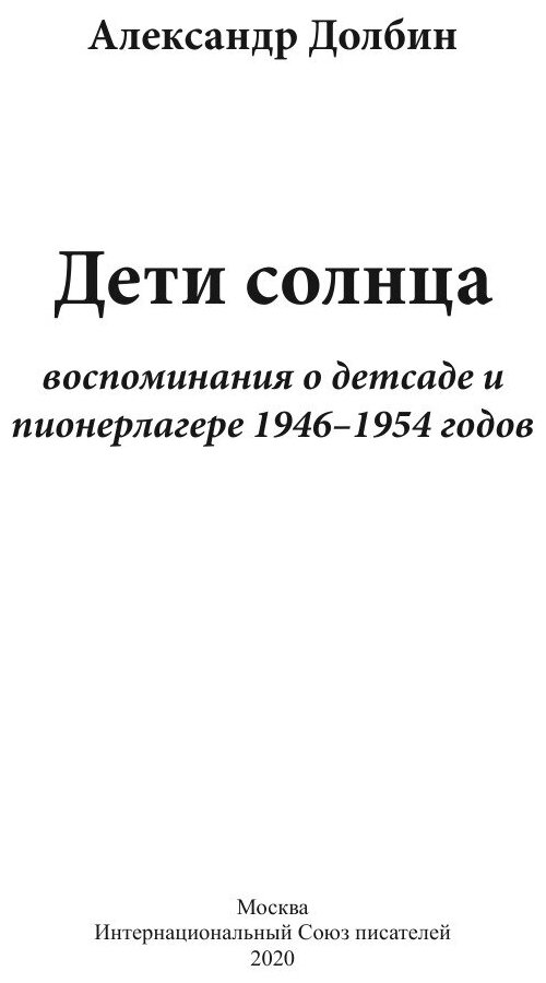 Дети солнца. Воспоминания о детсаде и пионерлагере 1946–1954 годов (Александр Долбин); "Издательство "Интернационального союза писателей", 2020