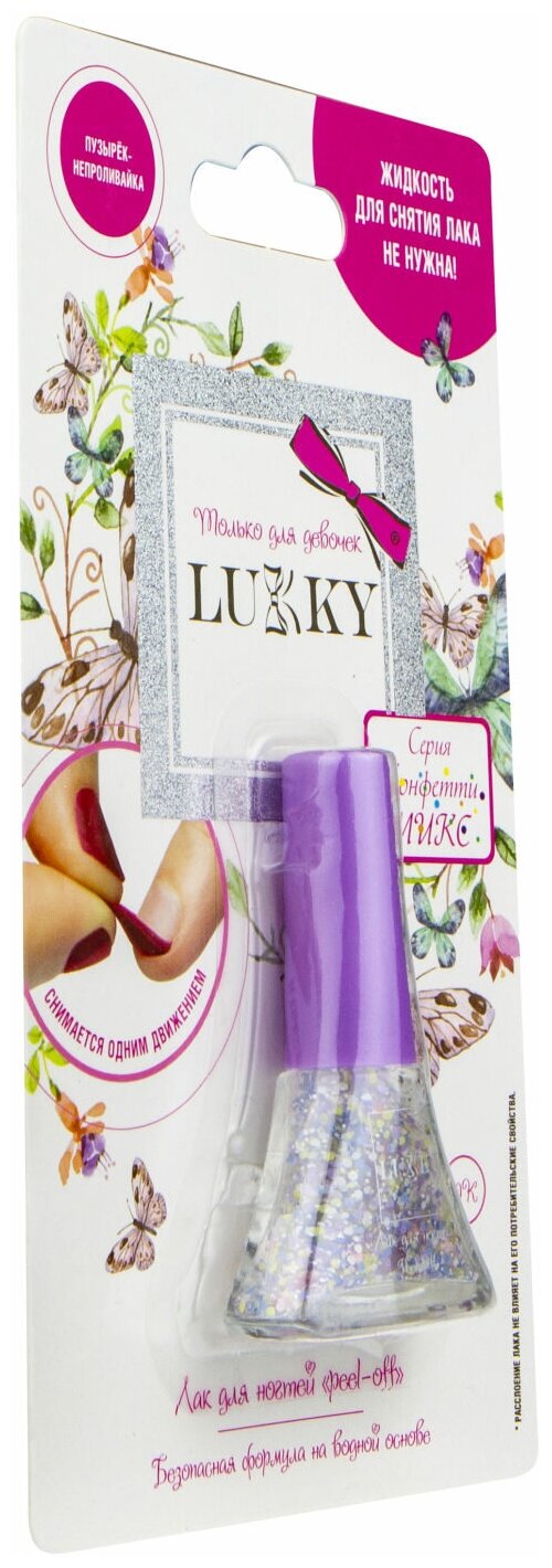 Что может быть лучше, чем накрасить ногти ярким лаком? Конечно, красить и перекрашивать их снова и снова. Волшебный лак для ногтей сиренево-голубого цвета с искрящимися блёстками в виде звёздочек (код 10К) из серии Конфетти-микс идеально подходит для этого, ведь безопасная формула позволяет удалять его с ноготков, словно плёнку, не пользуясь специальными жидкостями. Пузырёк-непроливайка не даёт лаку вытечь, даже если девочка случайно опрокинет его. Детская косметика Lukky из серии Конфетти-микс отличается от обычной серии яркими сверкающими блёстками и будет особенно уместно смотреться на праздниках и новогодних утренниках.Лак для ногтей Lukky использует водную основу, содержит безопасные компоненты и даже питает ногти, не нанося им ущерба.