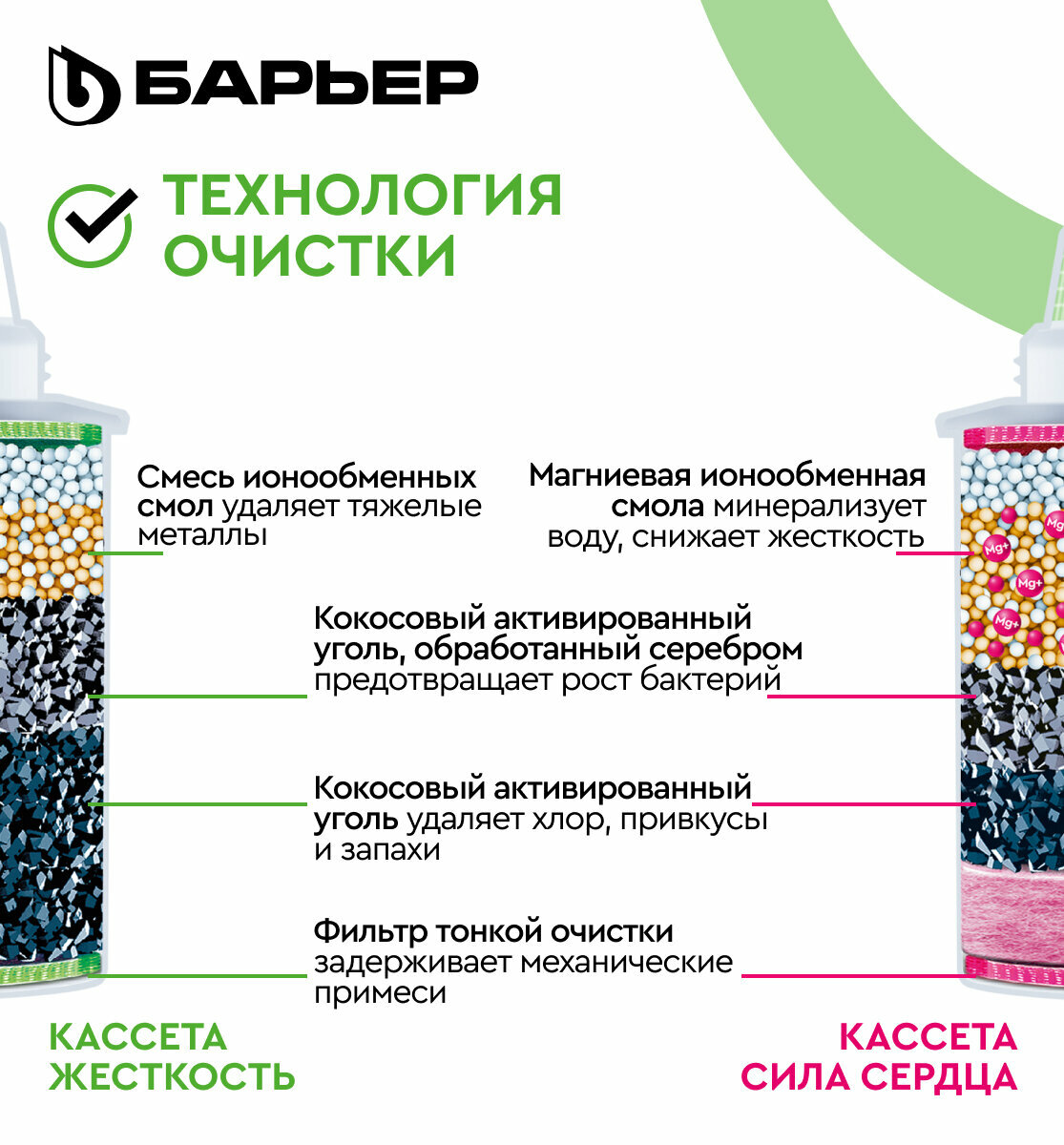 Выгодный комплект из трех кассет БАРЬЕР ""Жесткость"" и одной кассеты "Сила Сердца" позволит надолго избавиться от накипи, а также получить воду, обогащенную незаменимым макроэлементом - магнием.