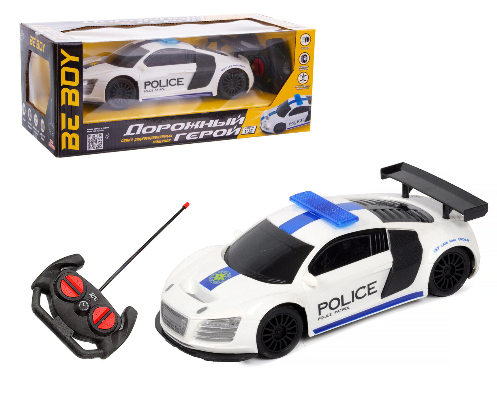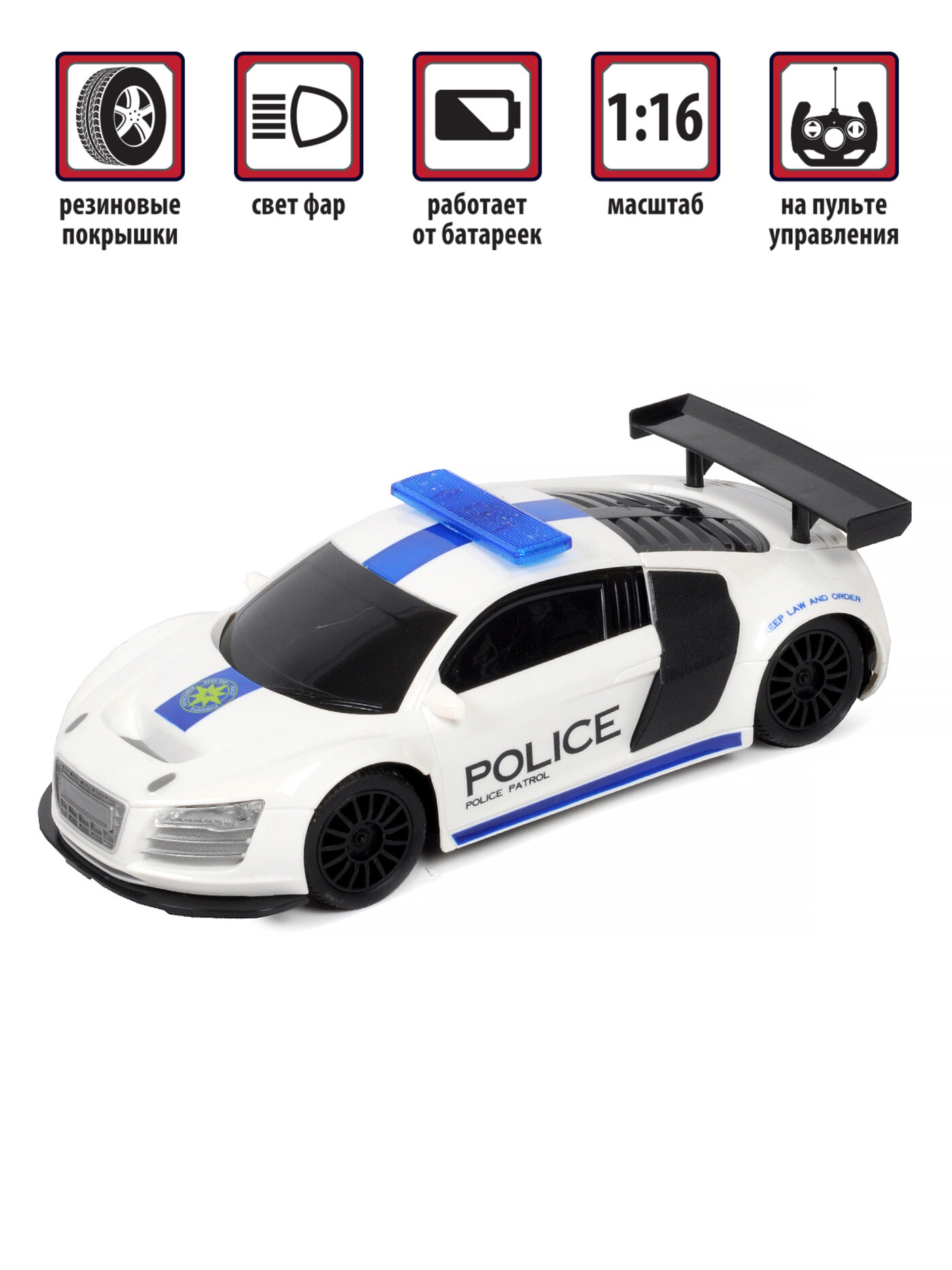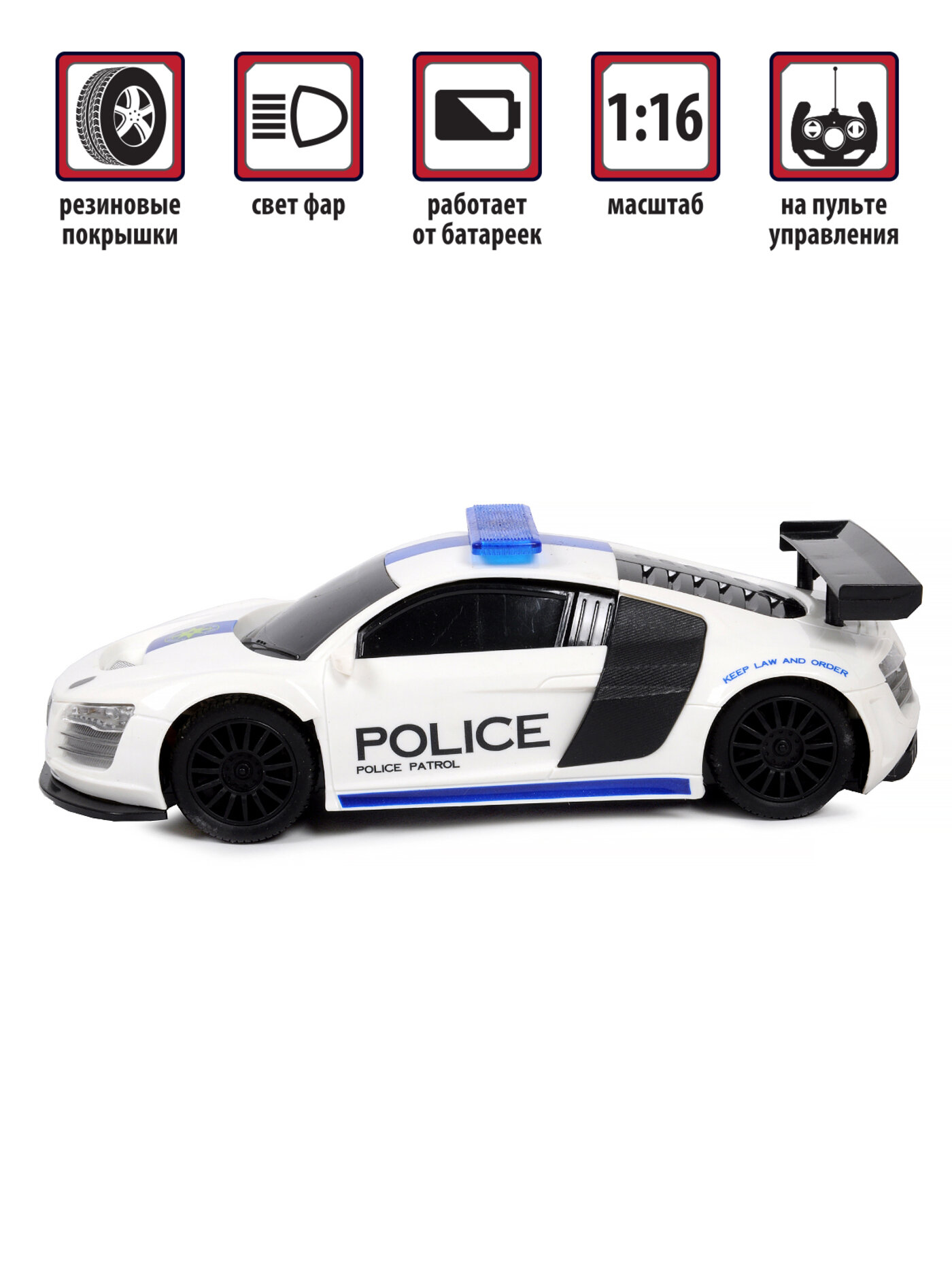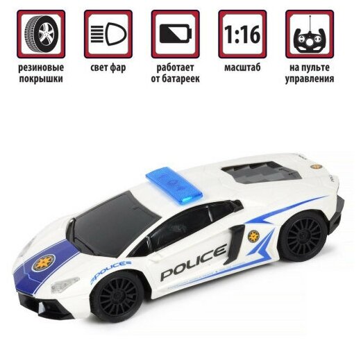 Игрушка является копией спортивного элитного автомобиля в масштабе 1:16 и имеет дизайн полицейской машины.