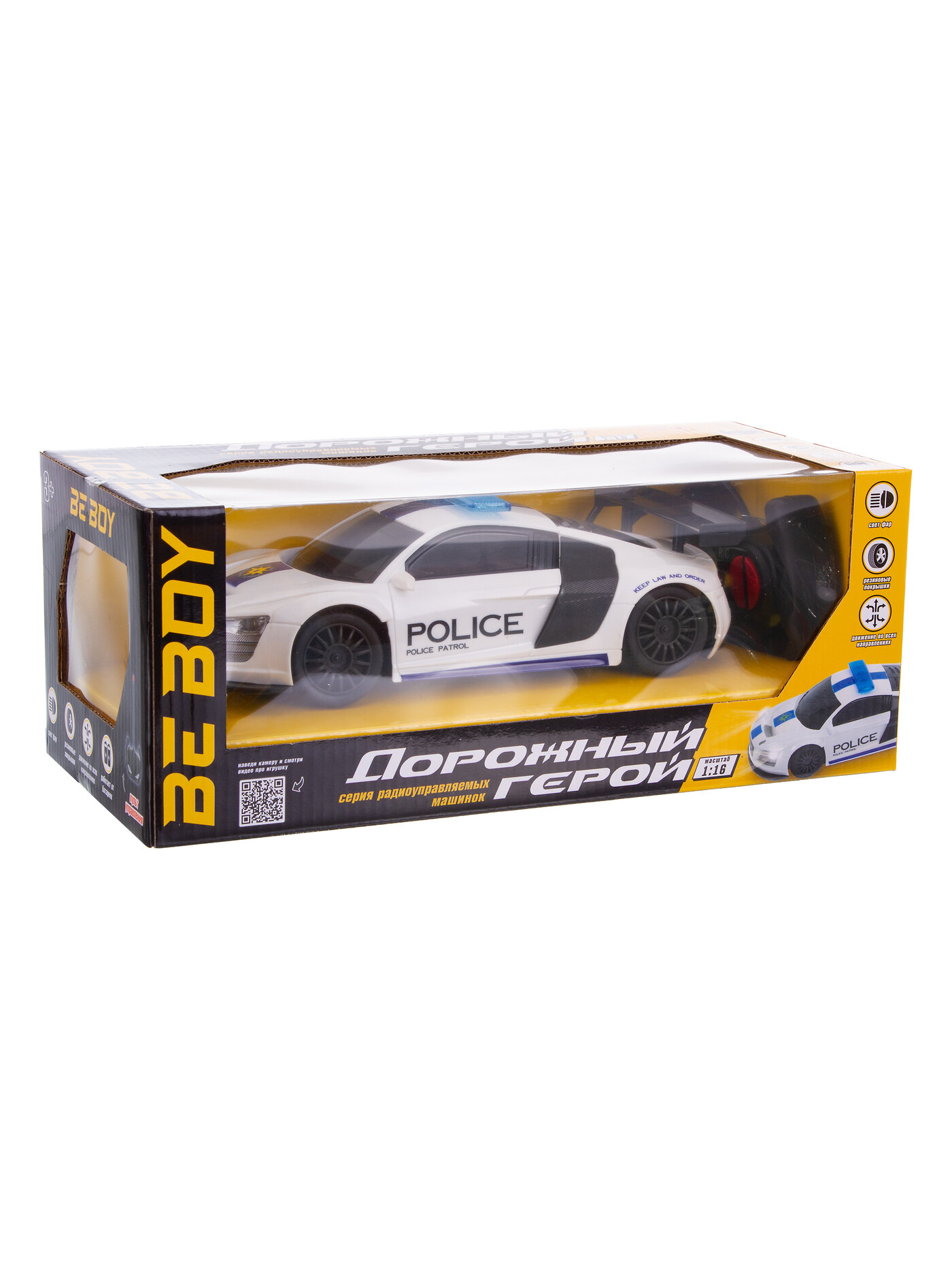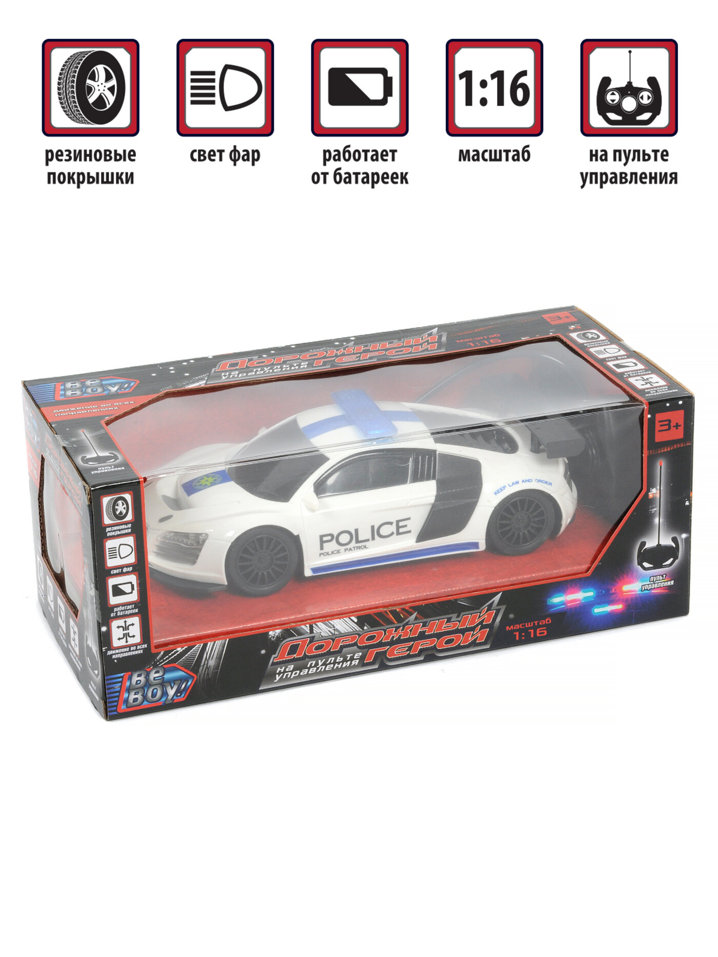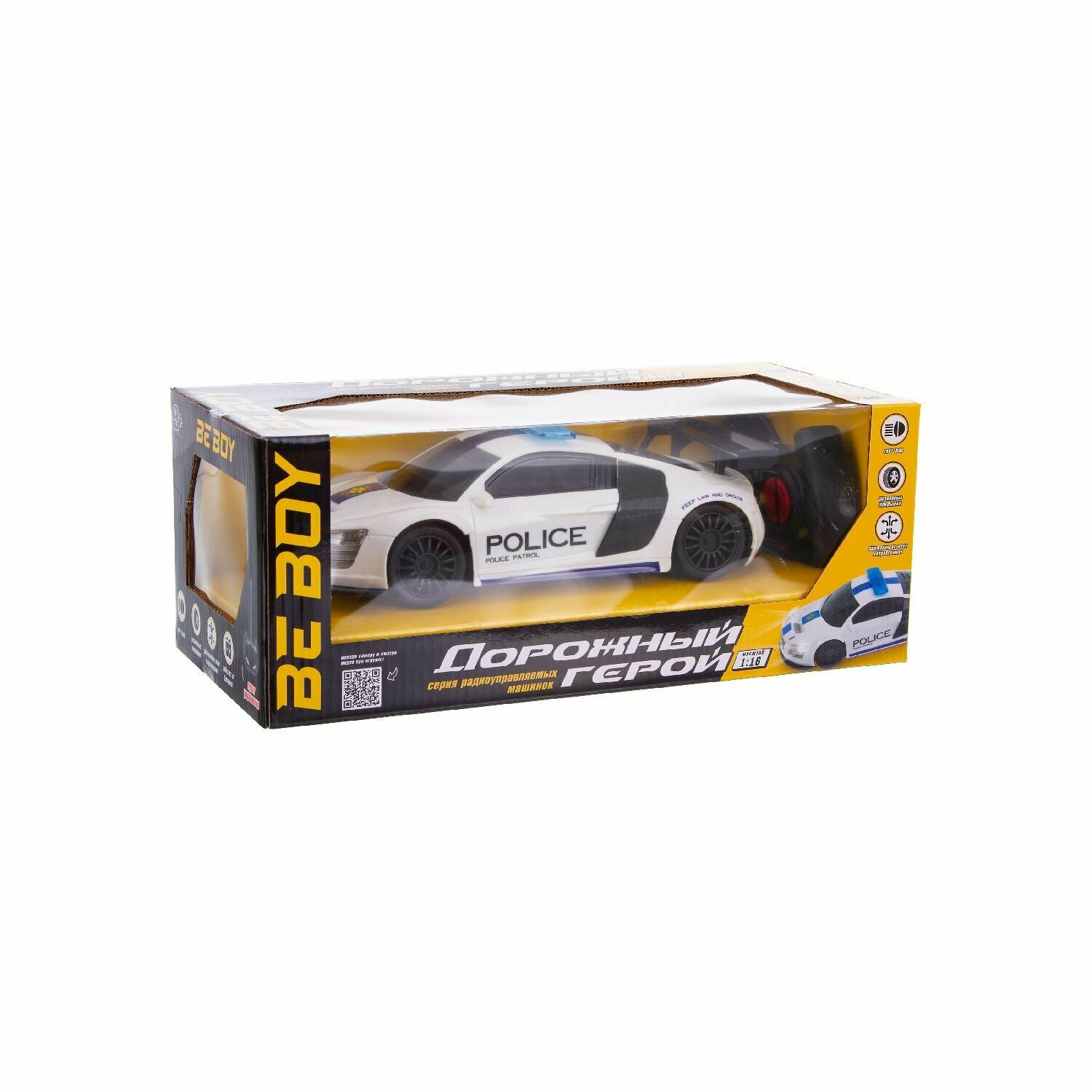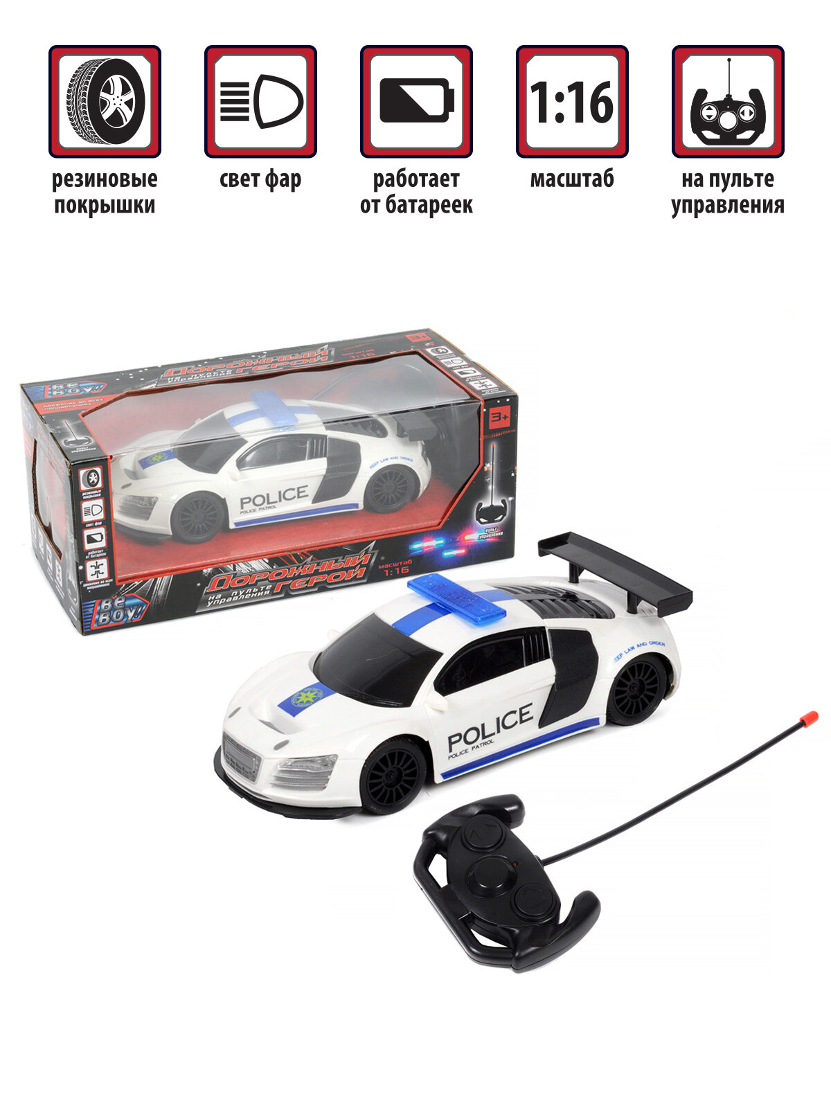 Игрушка является копией спортивного элитного автомобиля в масштабе 1:16 и имеет дизайн полицейской машины.