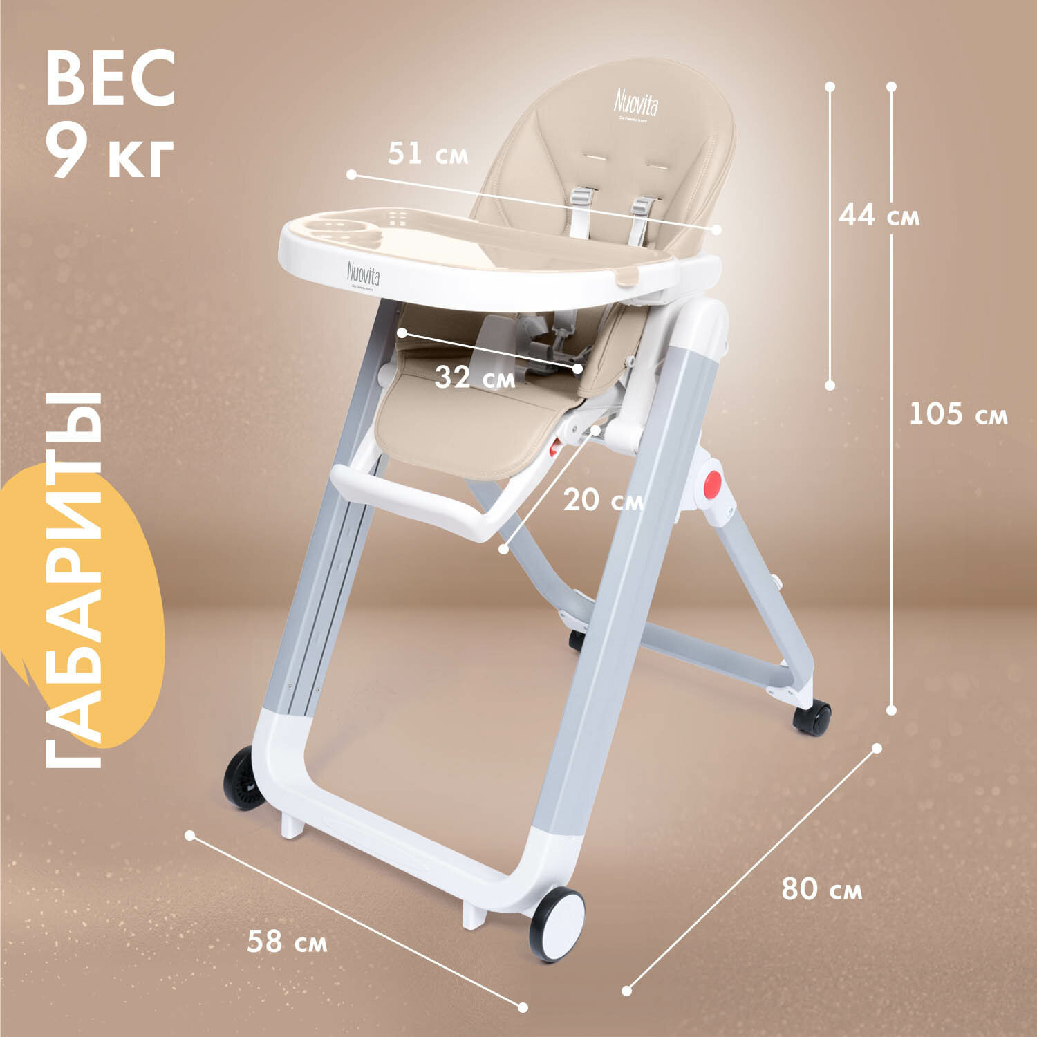 Присутствие на столешнице съёмного подноса с углублением для чашки или бутылочки создаёт дополнительные преимущества, облегчает кормление малыша и последующую уборку. Столик также можно легко снять, для этого достаточно потянуть, нажимая, скрытую под ним рукоятку. Высота столика может регулироваться в двух положениях, чтобы подросшему ребёнку было удобнее кушать.