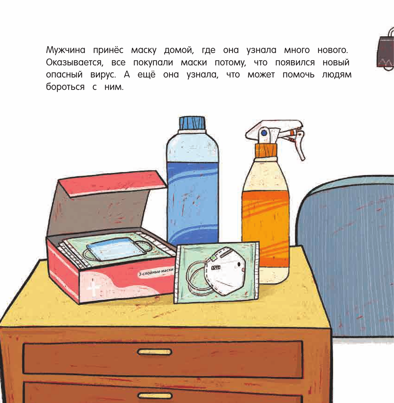 -  Тарасова Маргарита- 25 августа 20204/5 Эта история поможет рассказать ребенку о том, с чем мы все столкнулись во время пандемии. Она о мужестве, доброте, терпении. Ребенку сложно объяснить, почему так сильно изменился привычный образ жизни. И, если вы не знаете, какие слова подобрать, чтобы не напугать ребенка, то обязательно прочитайте эту книгу. История ведется от лица медицинской маски, ребенку так проще будет воспринимать информацию. Плюс в книге очень много картинок.