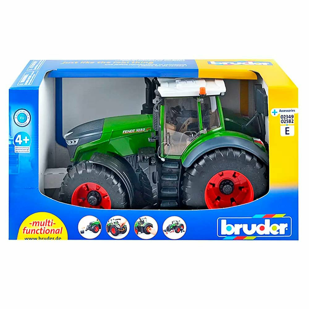 Bruder Трактор Fendt 1050 Коллекция юного любителя техники пополнится еще одной реалистичной копией сельскохозяйственного трактора Игрушка в точности повторяет модель Fendt 936 Vario, в том числе и характерный для конструкции фаркоп и тягово-сцепное устройство с регулируемым по высоте подъемным механизмом, с помощью которых изделие можно дополнить тематическими игровыми аксессуарами. Капот трактора открывается, позволяя рассмотреть его реалистичный двигатель, а при открывании дверей кабины дети внимательно изучат салон с сиденьем водителя и приборной панелью. Игрушка будет правдоподобно ездить по поверхности, так как ее широкие колеса с рельефными протекторами вращаются и позволяют игрушке двигаться. А поворачивать колеса можно с помощью дополнительного руля, доступ к которому осуществляется через крышу. Благодаря амортизаторам на передней оси трактора ему не страшны никакие препятствия на пути, и он без труда их преодолевает. Изделие выполнено из высококачественного пластика с повышенной прочностью, поэтому долгое время послужит ребенку и сохранит привлекательный внешний вид. Игрушка окрашена в яркие цвета сертифицированными, стойкими красителями и дополнена тематическими наклейками с названием бренда спецтехники. Примечание: игрушку можно дополнить различными модулями, фигурками, прицепами, сдвоенными колесами или аксессуарами, приобретаются отдельно.