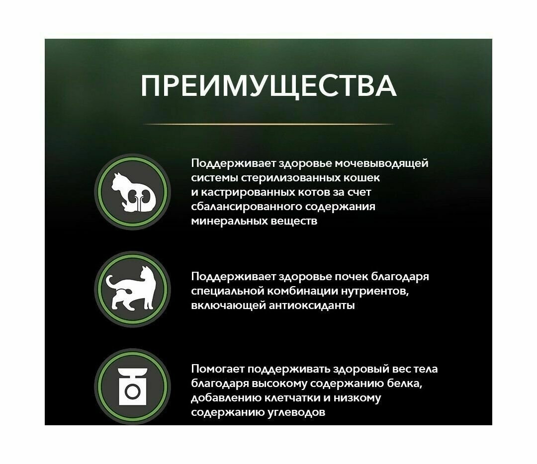 Поддерживает здоровье мочевыводящей системы стерилизованных кошек и кастрированных котов за счет сбалансированного содержания минеральных веществ.