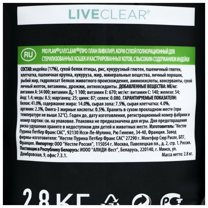 Корм для кошек Pro Plan Live Clear для стерилизованных, индейка сух. 1,4кг