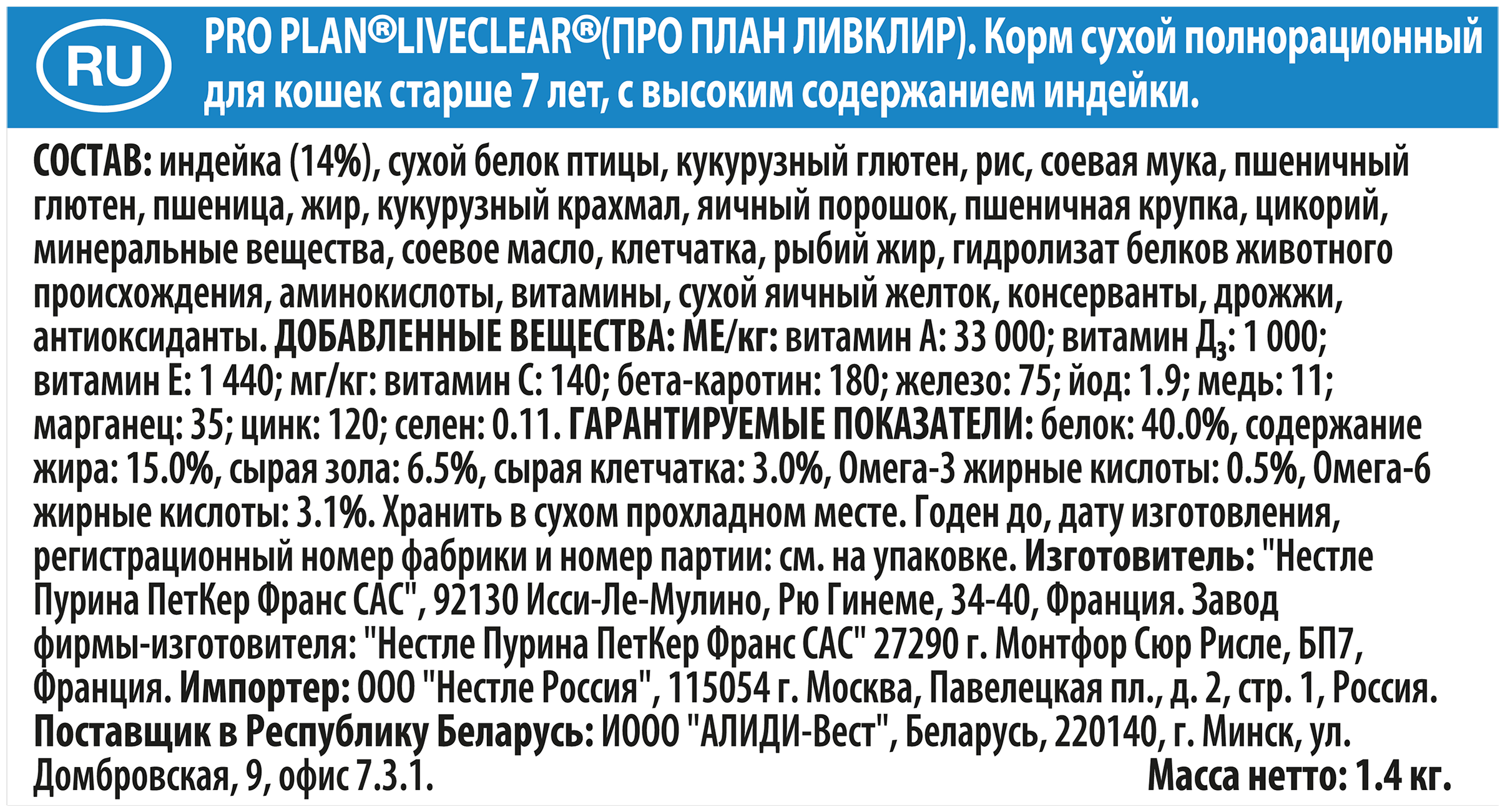 | Размер | Live Clear для стерилизованных старше 7 лет, индейка сух. 1,4кг |