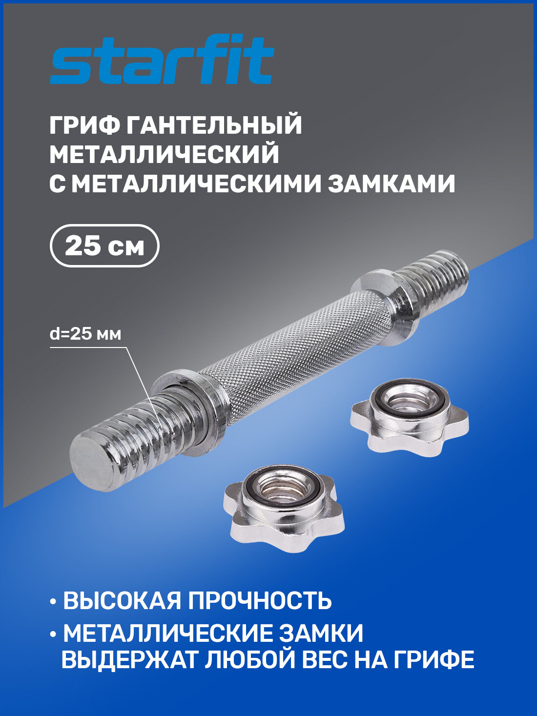 Гриф гантельный металлический STARFIT BB-107, с металлическими замками, подходит для дисков с диаметром входного отверстия 26 мм. гриф выполнен из литого прочного металла, что позволяет собрать наибольший вес гантели качественная насечка на рукояти обеспечивает надежное сцепление со снарядом.