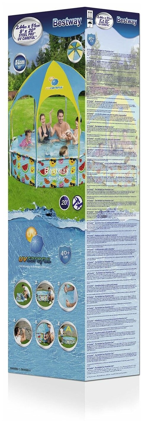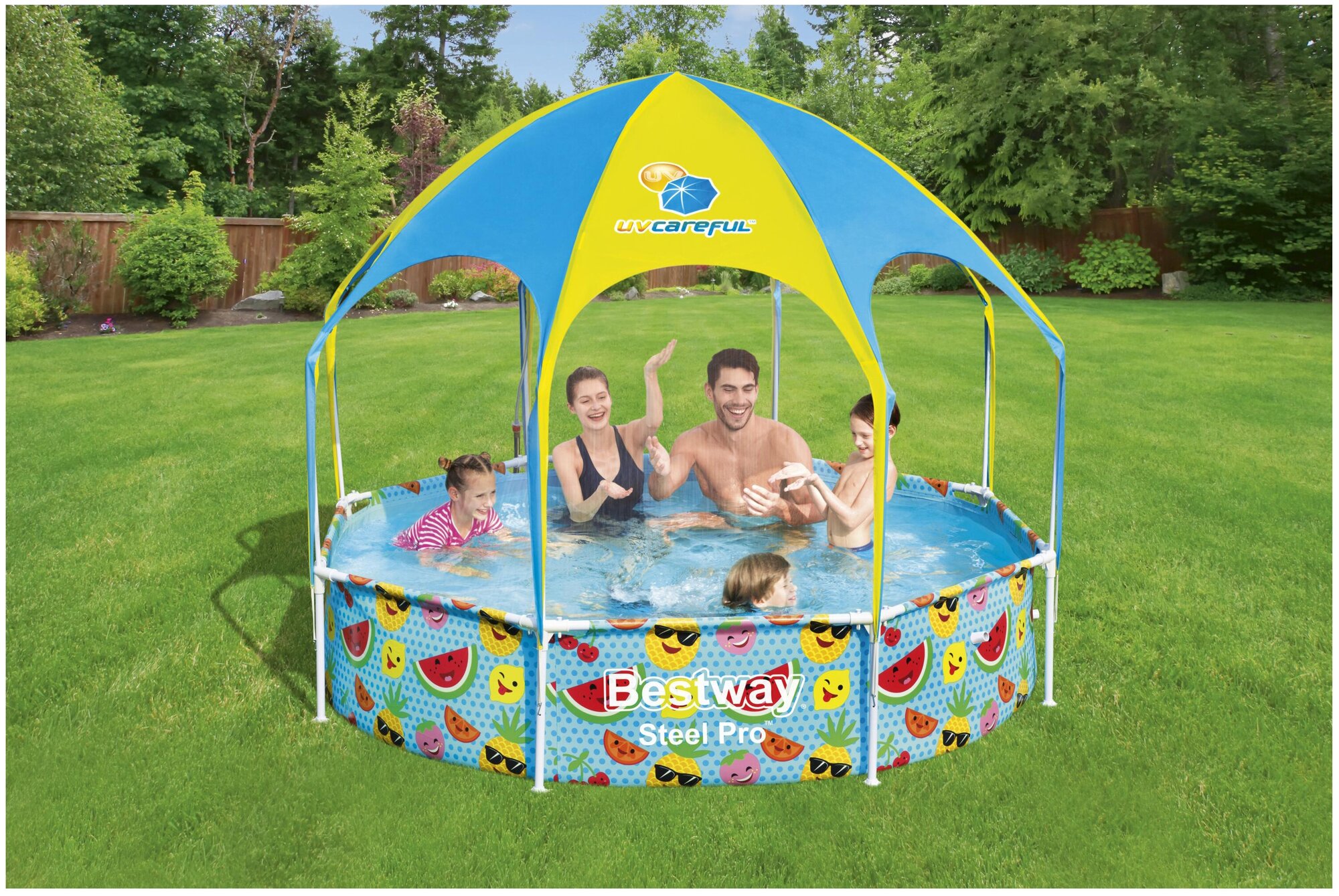 Каркасный бассейн Bestway для детей и семейного отдыха. Чаша выполнена из высококачественного трехслойного ПВХ: два слоя плотного винила и один - полиэстер для особой прочности. Каркас металлический нержавеющий оцинкованный.