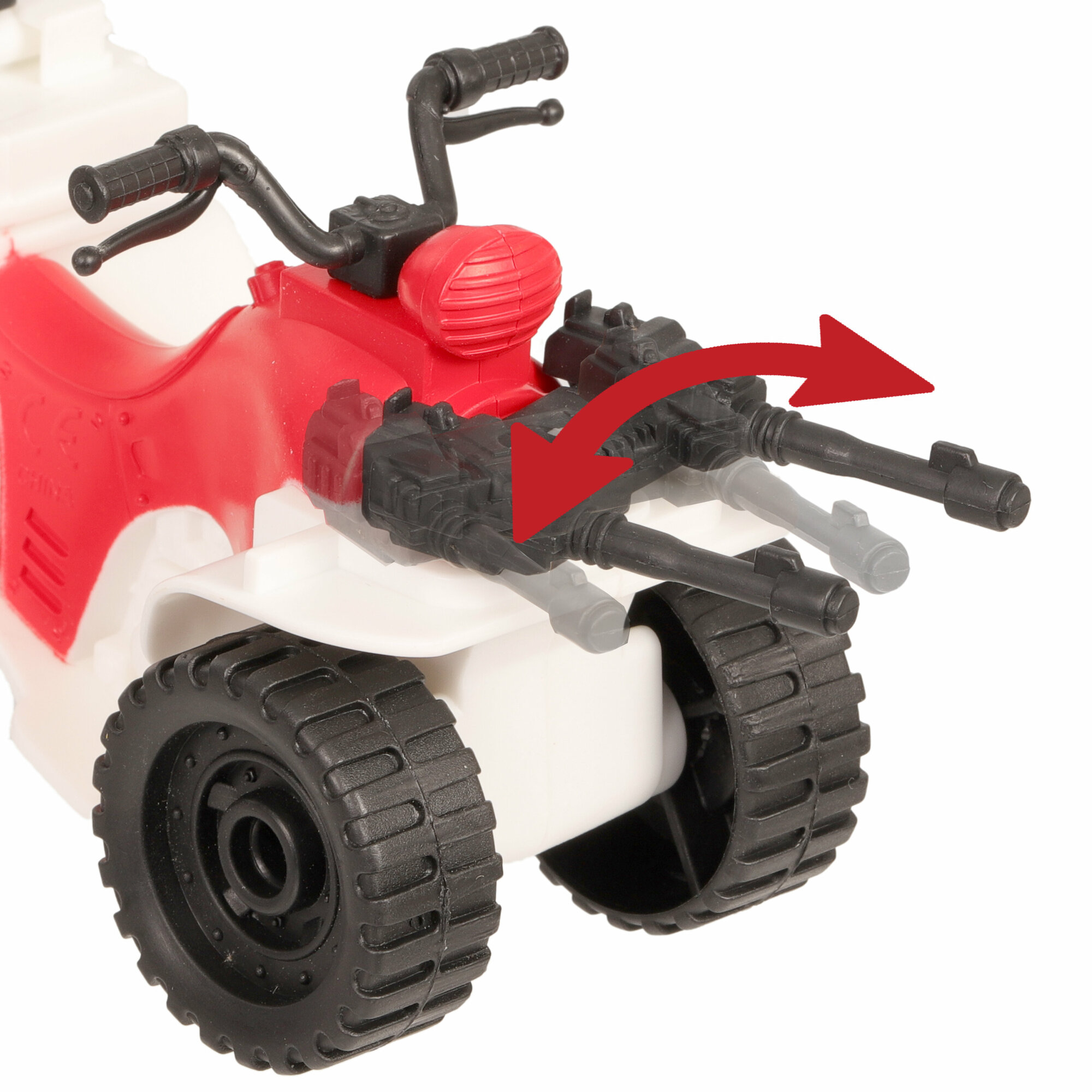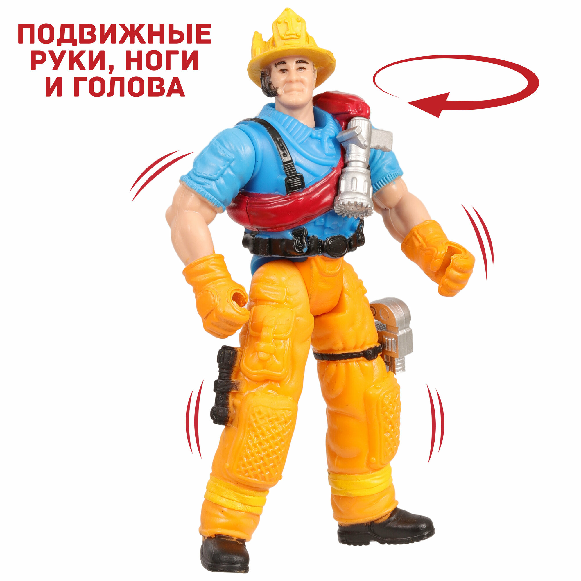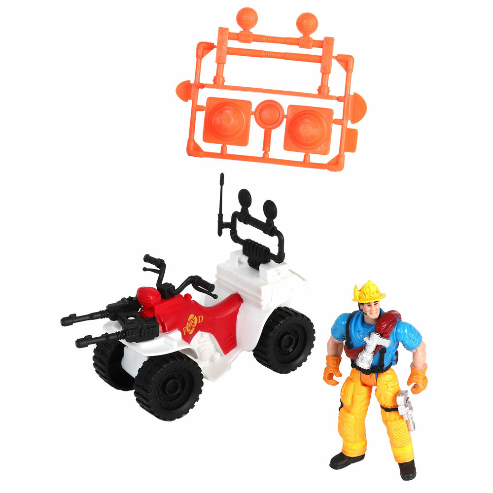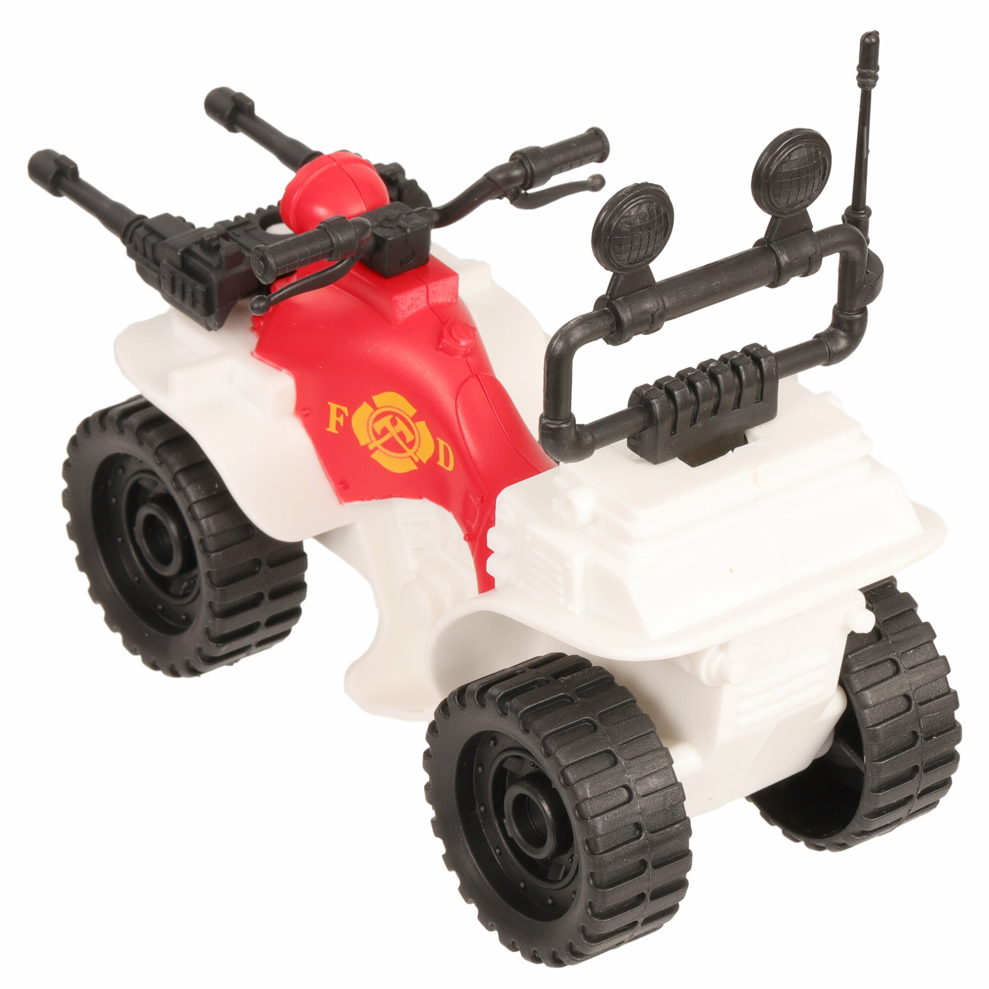 - это лучший подарок для ребенка. В наборе идет фигурка пожарного 10 см (подвижный:руки, ноги) и красно белый квадроцикл 11 см с крутящимися колесами и имитацией водяных пушек и аксессуарами.