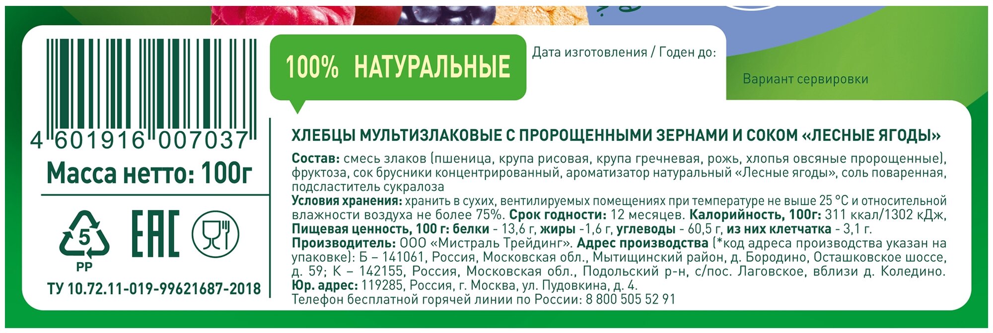 Описание товара:Хлебцы мультизлаковые с пророщенными зёрнами и соком Fristart "Лесные ягоды". 100% натурально. Без сахара. 5 в 1: яркий вкус, польза, стройность, комфорт, легкость. Цельные злаки: "медленные" углеводы и клетчатка для здорового пищеварения и чувства сытости надолго. Пророщенные зёрна: живой микс питательных веществ и антиоксидантов для красоты и молодости. Удобная упаковка: идеальный перекус в офисе, дома и в дороге. Многоразовая клипса для открывания и хранения. ТУ 10.72.11-019-99621687-2018.Состав товара:Смесь злаков (пшеница, крупа рисовая, крупа гречневая, рожь, хлопья овсяные пророщенные), фруктоза, сок брусники концентрированный, ароматизатор натуральный «Лесные ягоды», соль поваренная, подсластитель сукралоза.Меры предосторожности:Хранить в сухих, вентилируемых помещениях при относительной влажности воздуха не более 75%.