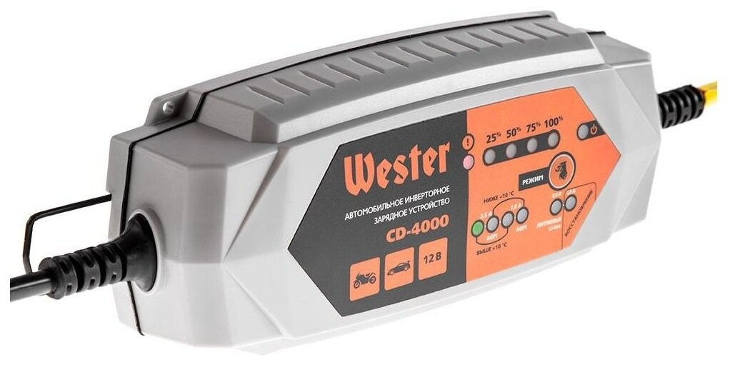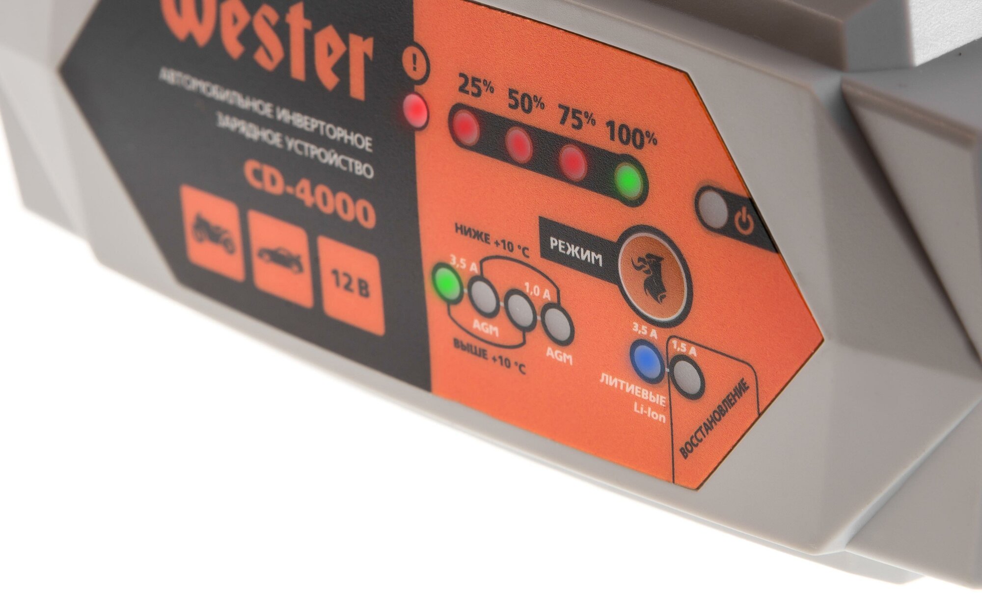 Зарядное устройство WESTER CD-4000 для АКБ 12В, макс 3,5А, АКБ до 120АчЗарядное инверторное устройство WESTER CD-4000 для АКБ 12ВДанные зарядные устройства предназначены для зарядки 12 – вольтовыхобслуживаемых и необслуживаемых свинцово-кислотных (Pb), гелевых (Gel) и кальциевых (Ca) аккумуляторных батарей (АКБ), свинцовых батарей технологии AGM а также литий-ионных АКБ (Li-ION, LITHIUM).Емкость заряжаемой АКБ 2 – 120АчМин. напряжение АКБ 3ВПыле- и влагозащищенность IP54