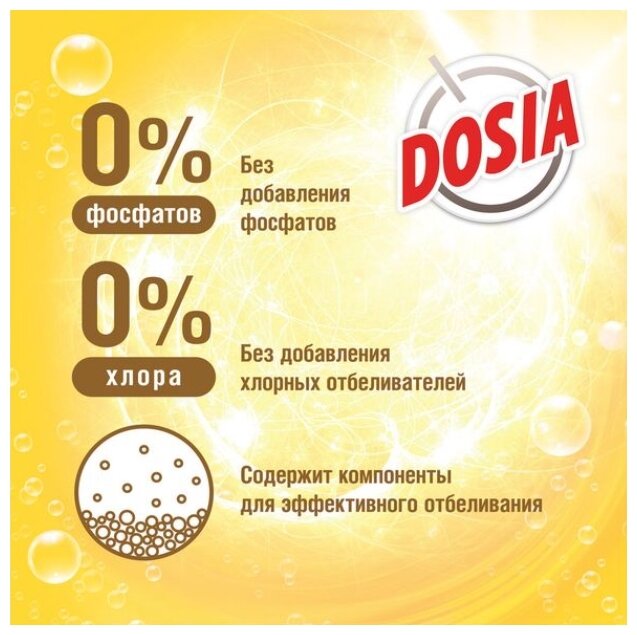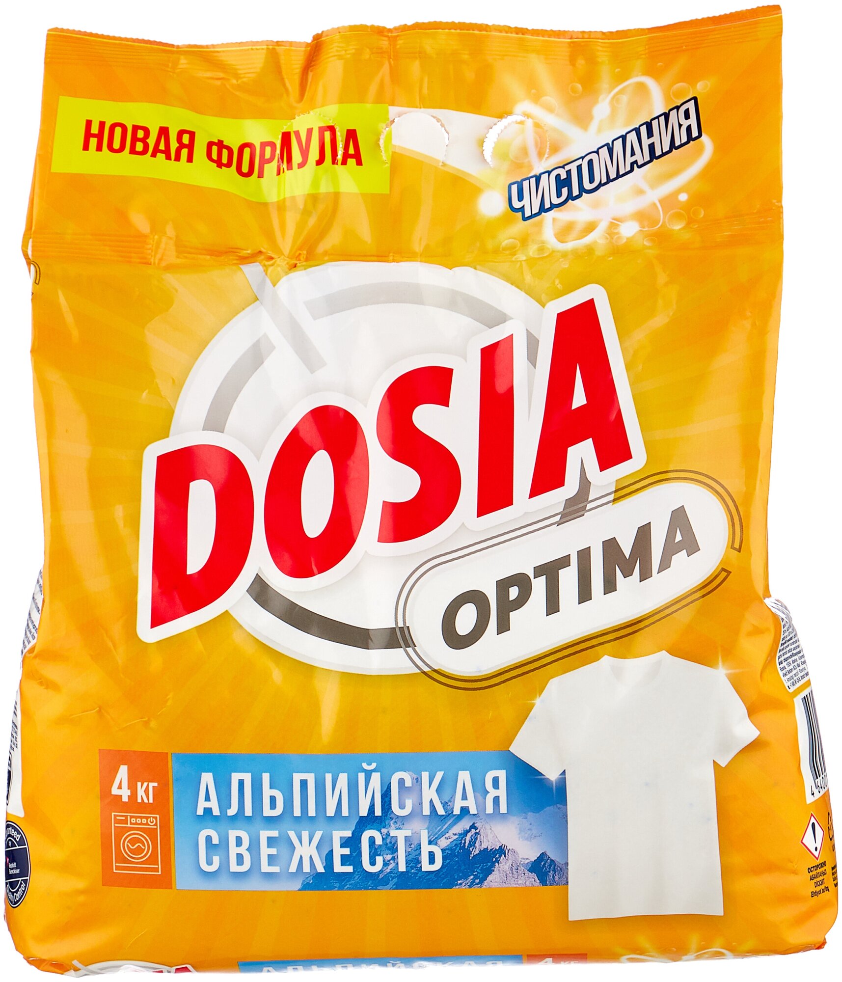 Dosia optima Альпийская свежесть - отлично справится с различными загрязнениями и придаст белью неповторимую свежесть. Благодаря оптимальной формуле для повседневной стирки, порошок Dosia:- Прекрасно справляется с различными пятнами- Отстирывает бережно и эффективно, не повреждая волокна ткани- Придает белью приятную свежестьСпециально разработанная формула порошка Дося Оптима Альпийская свежесть- содержит компоненты для эффективного отбеливания- не содержит фосфаты- не содержит хлорных отбеливателей.