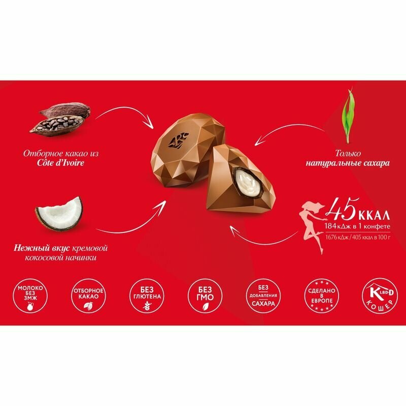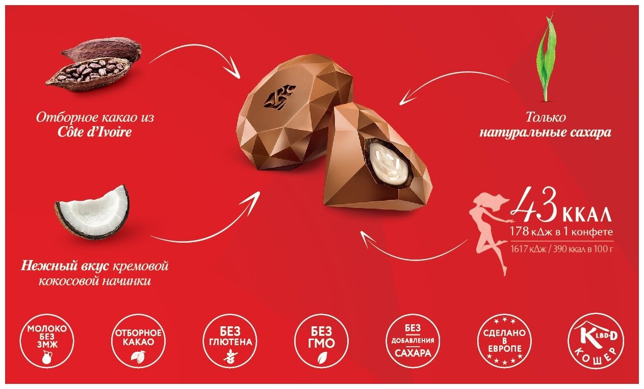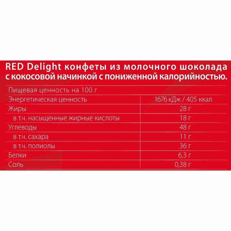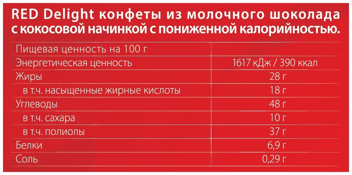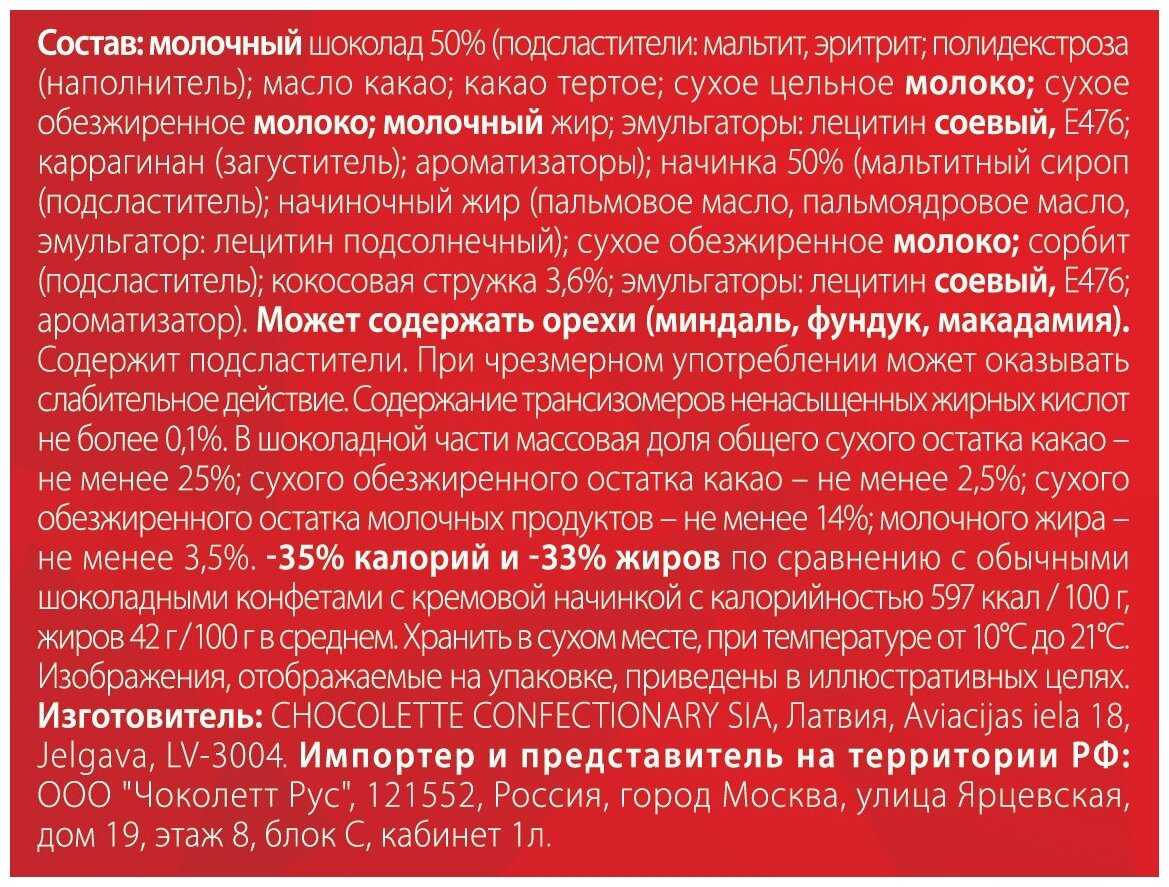 Состав: Состав: молочный шоколад 50% (подсластители: эритрит, мальтит; полидекстроза (наполнитель); масло какао; какао тертое; сухое цельное молоко; сухое обезжиренное молоко; молочный жир; эмульгаторы: лецитин соевый, E476; каррагинан (загуститель), ароматизаторы; стевиолгликозид (подсластитель)); начинка 50% (сироп мальтитола (подсластитель); растительный жир (пальмовое масло, пальмоядровое масло, эмульгатор: лецитин подсолнечный); сухое обезжиренное молоко; сорбит(подсластитель); кокосовая стружка 3,6%;эмульгаторы: лецитин соевый, E476; ароматизатор). Может содержать орехи (миндаль, фундук, макадамия, кешью).