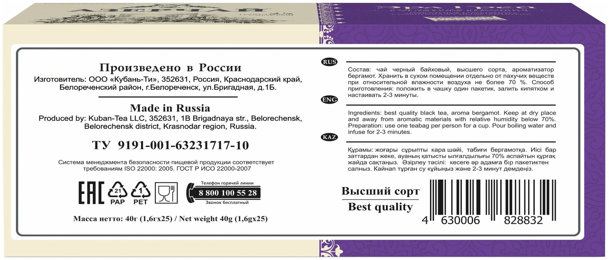 | Состав | Чай черный байховый высшего сорта, ароматизатор бергамот. |