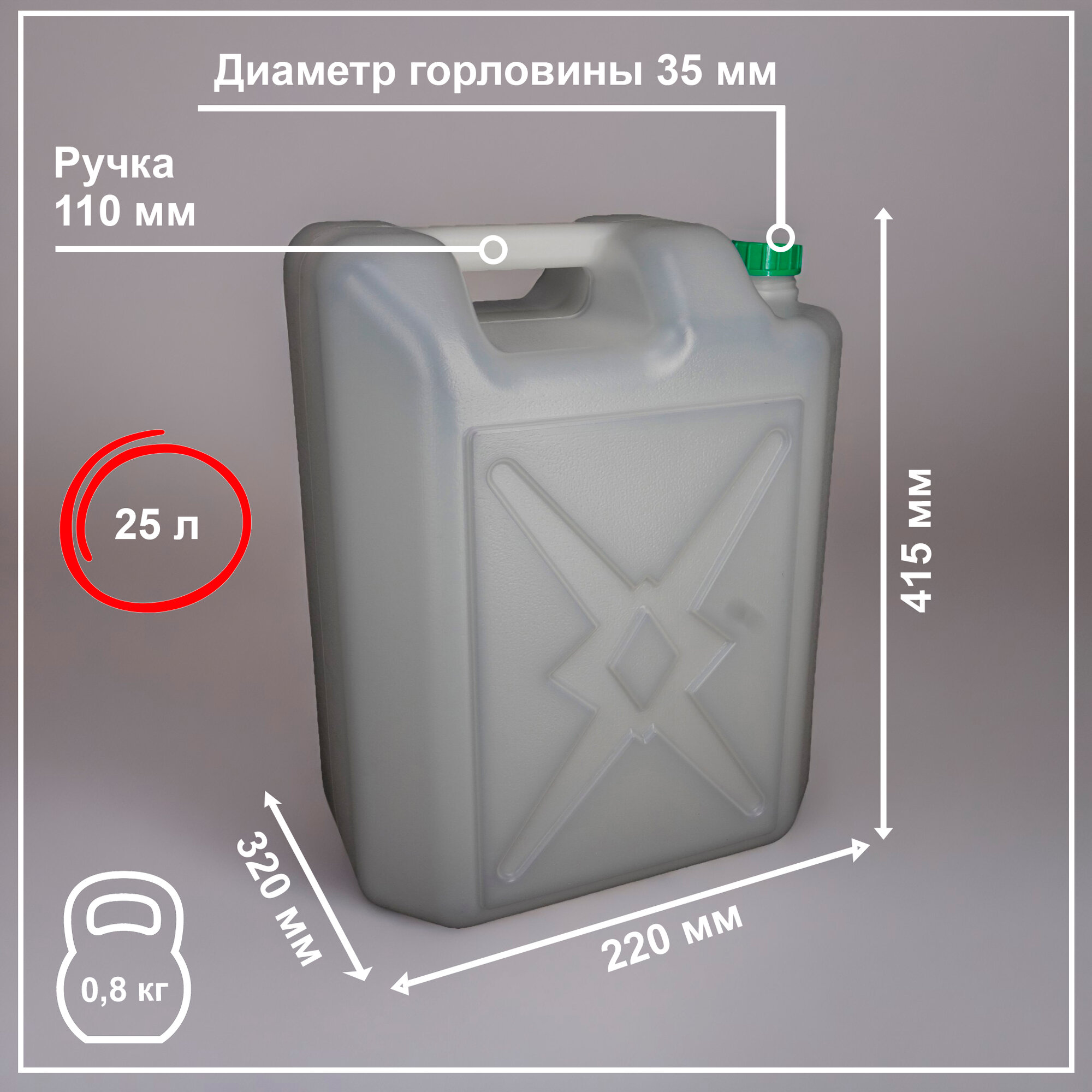 Канистра плотно закручивается крышкой, а для удобства переноски имеется встроенная ручка.