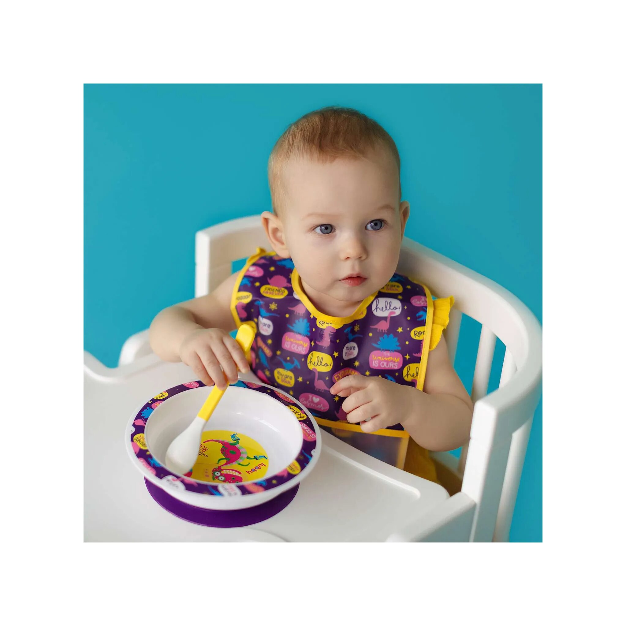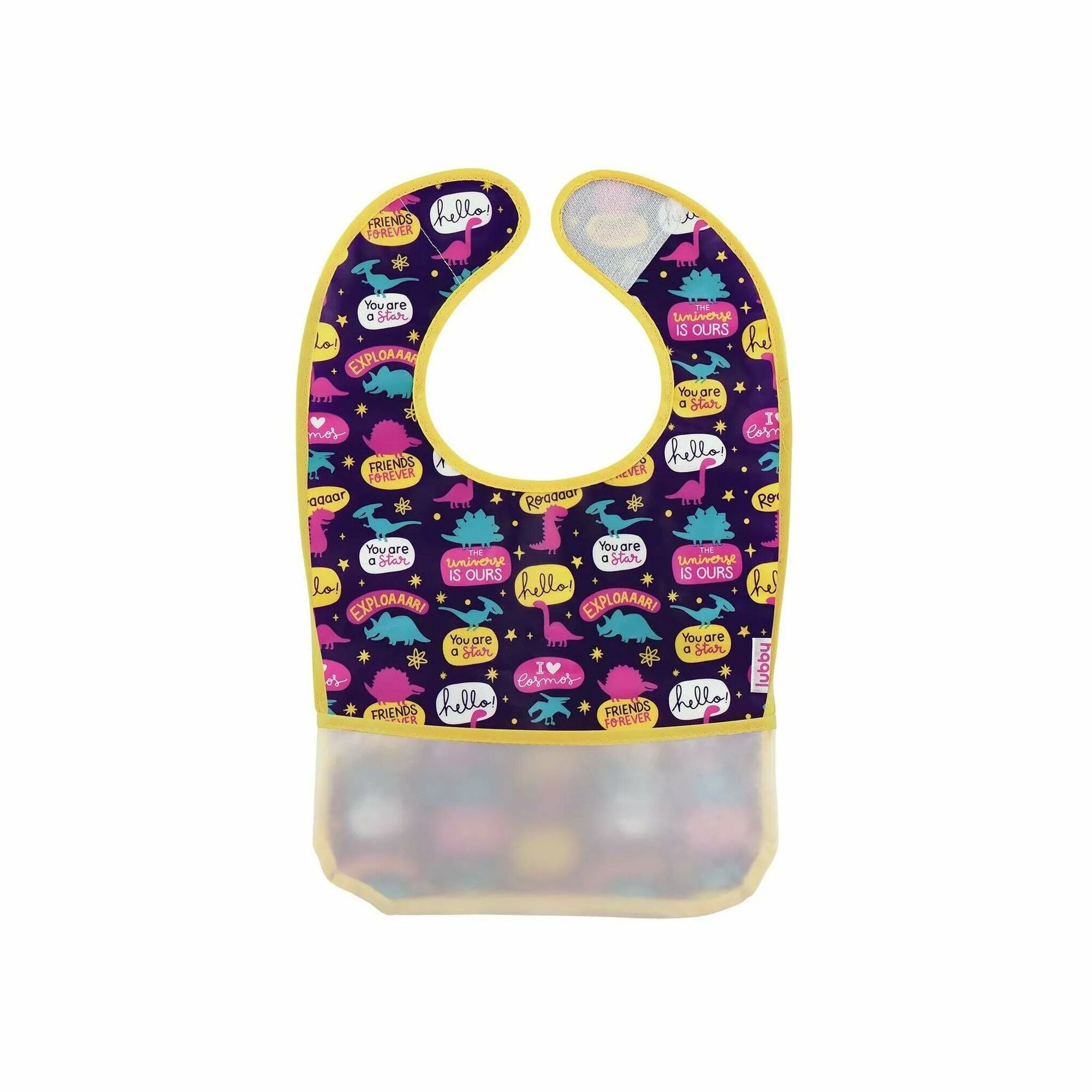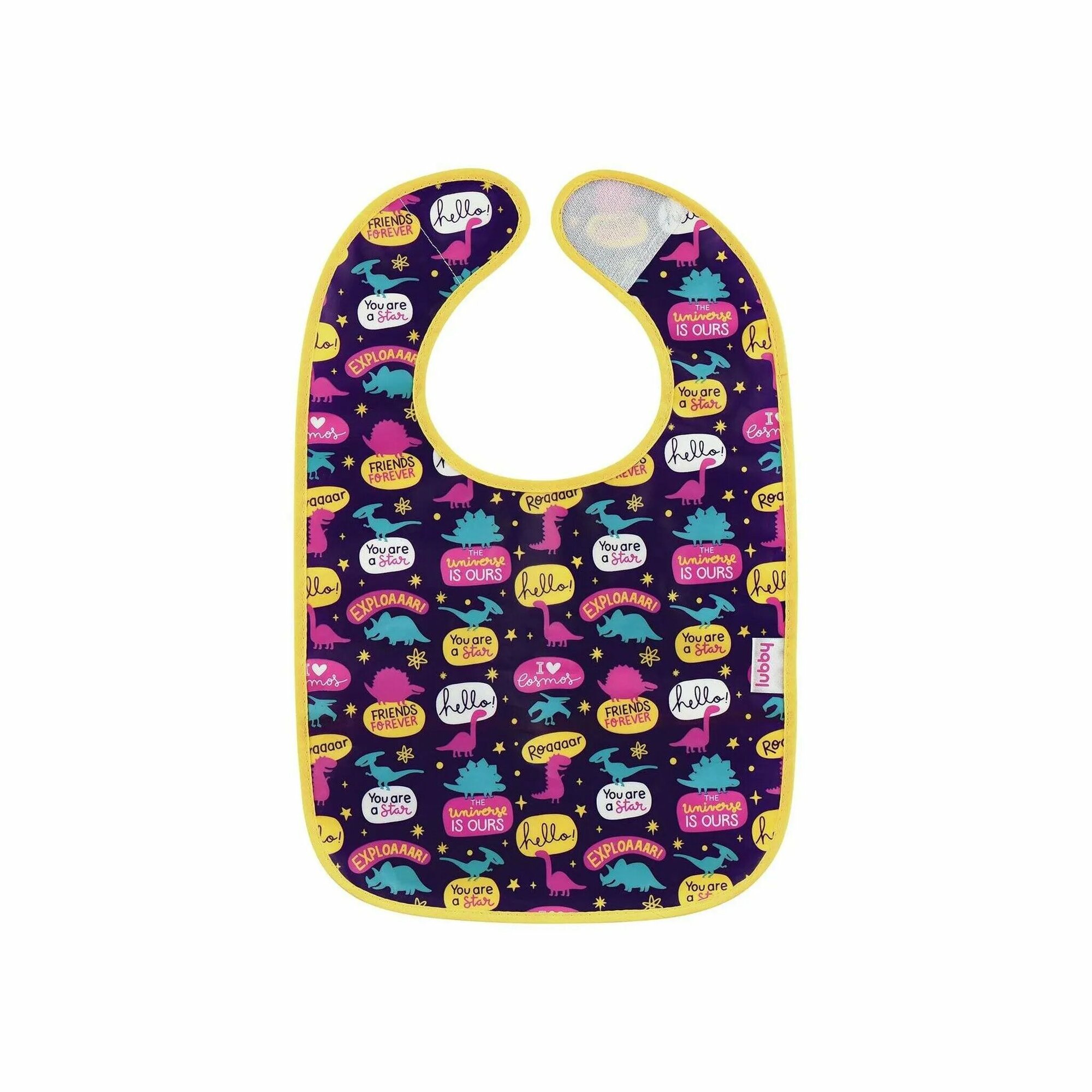 Нагрудник украшен узором с забавными динозавриками, которые обязательно понравятся малышу!