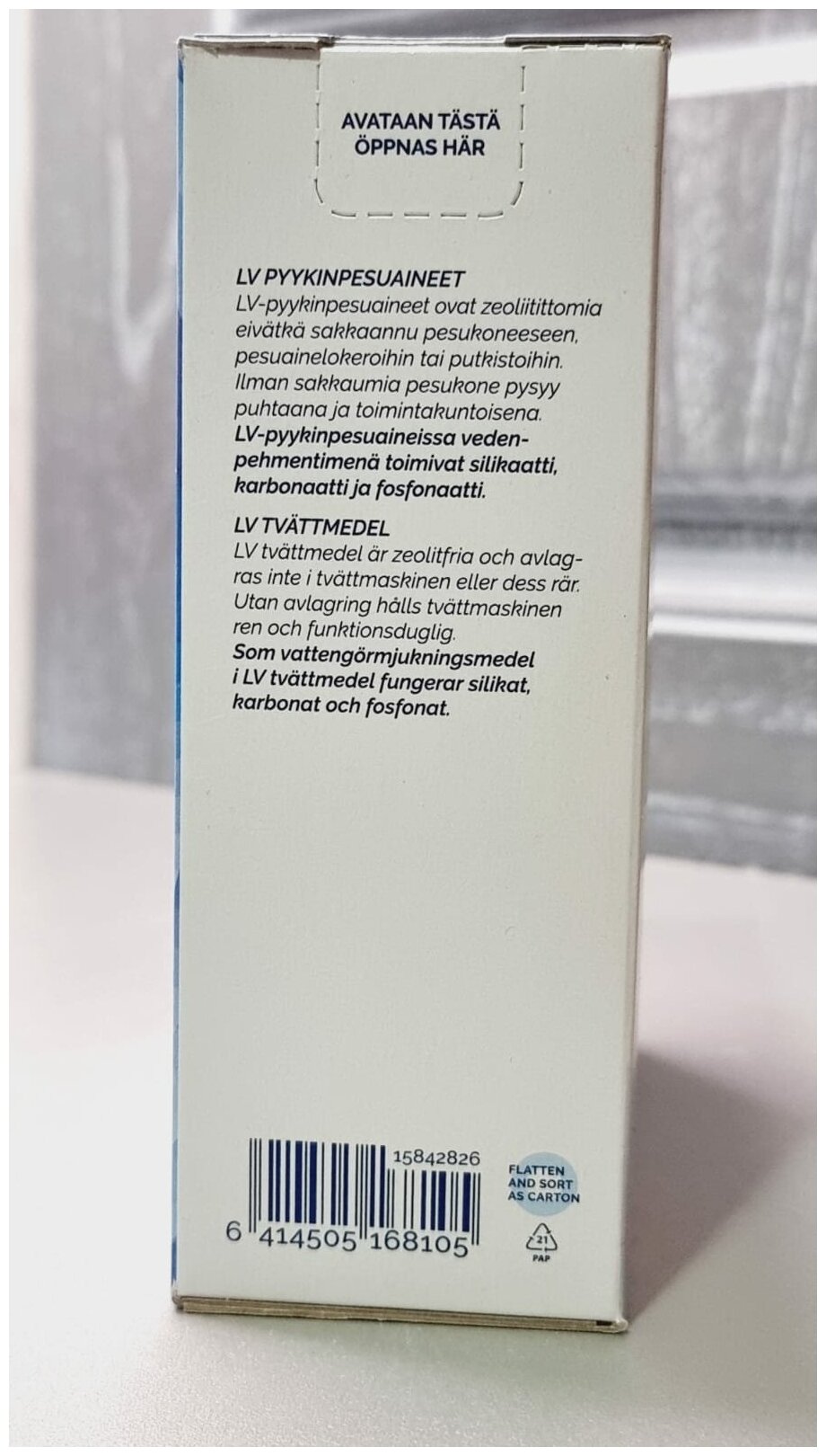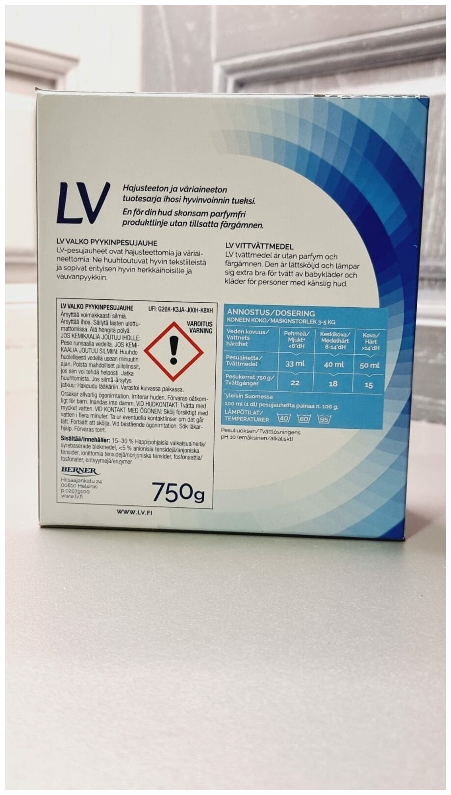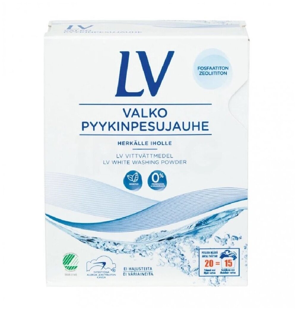 LV Концентрированный стиральный порошок для белого белья 750 г Цена в розничном магазине может отличаться от цены интернет-магазина Стиральный порошок-концентрат для белого белья для чувствительной кожи без ароматизаторов и красителей. Не имеет запаха Количество стирок: 21 в мягкой воде и 15 стирок в воде средней жесткости (упаковка 750 гр.) - Изготовлен из высококачественного сырья. - Разработан при участии союза аллергиков и астматиков. Хорошо выполаскивается из текстиля, подходит для людей с чувствительной кожей и маленьких детей. Не содержит отбеливающих веществ, сохраняет цвет белья ярким. Не содержит цеолита и фосфата Дозировка: Мягкая вода 40 мл. Средне-жесткая вода 55 мл. Жесткая вода 70 мл. Дозировка для ручной стирки: 10 л. воды 15 мл порошка. Состав: 5-15% поверхностно-активные вещества несодержащие ионов, Меньше 5% мыла / поликарбоксилат, Ферменты СМС, ситрат и силикат, Не содержит ароматизаторов, красителей, оптических обесцвечивателей, цеолита и фосфата.