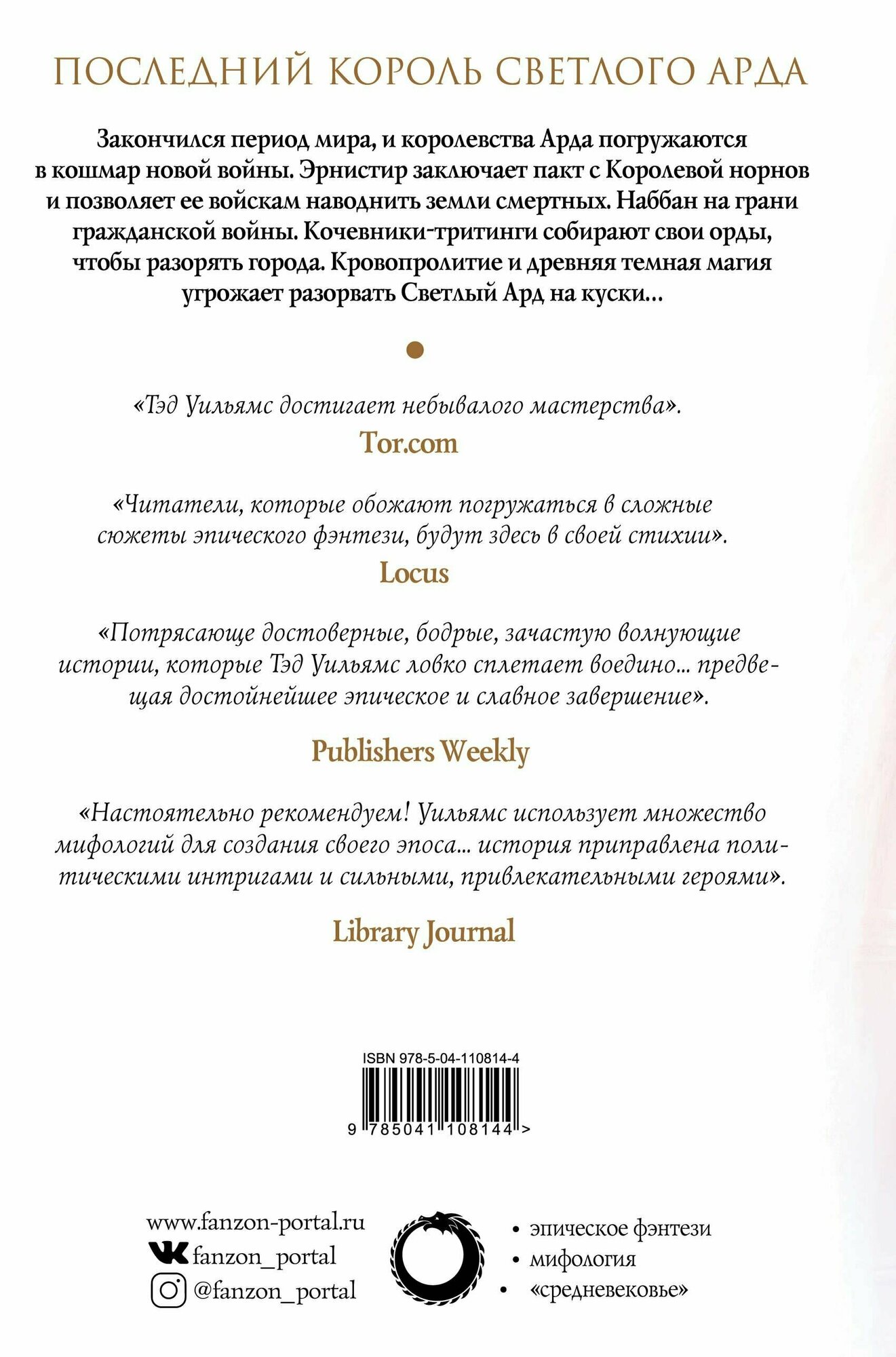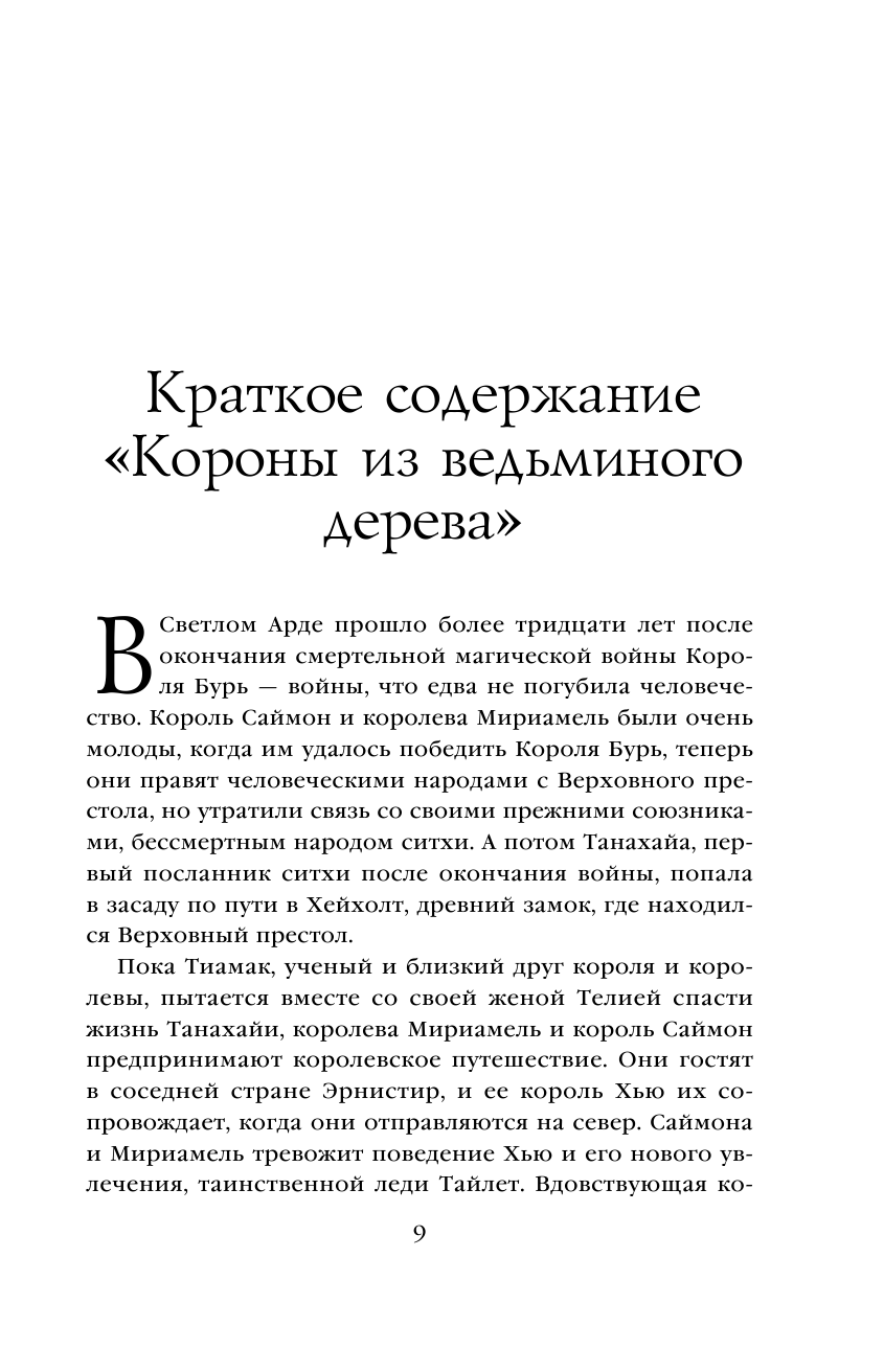 Верховный Престол в опасности. Эрнистир заключил договор с королевой норнов. Наббан на грани кровавой гражданской войны, а на равнинах Тритинг мобилизуются кочевники, объединенные суеверным пылом и вековой ненавистью. Страны и народы Светлого Арда ссорятся между собой, войны, кровопролитие и темная магия угрожают всем уничтожением. И над этим нависает тайна Короны из Ведьминого дерева. Пока все рвут Светлый Ард на части от страха и жадности, несколько человек будут бороться за свои жизни и судьбы, еще не осознавая, что от них зависит выживание всего мира.