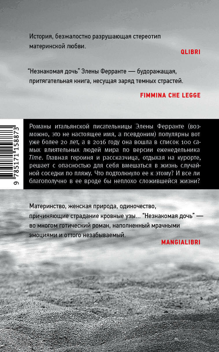 “Незнакомая дочь” — это тонкая и психологически выверенная проза, роман одновременно мрачный и вдохновляющий. У главной героини, профессора итальянского университета, внешне все неплохо — взрослые дочери живут отдельно, но регулярно звонят ей, бывший муж адекватен, она отдыхает в приятном местечке у моря... Но все ли благополучно в ее прошлом? Что заставляет эту красивую сорокалетнюю женщину вмешиваться (причем с опасностью для себя) в жизнь совершенно вроде бы чужой соседки по пляжу? Автор книги, Элена Ферранте, — личность загадочная, предпочитающая оставаться в тени своих книг. Неизвестно даже, пользуется ли она псевдонимом или пишет под собственным именем. Ее романы переведены на 40 языков, и в 2016 году она вошла в список 100 самых влиятельных людей мира по версии еженедельника Time.