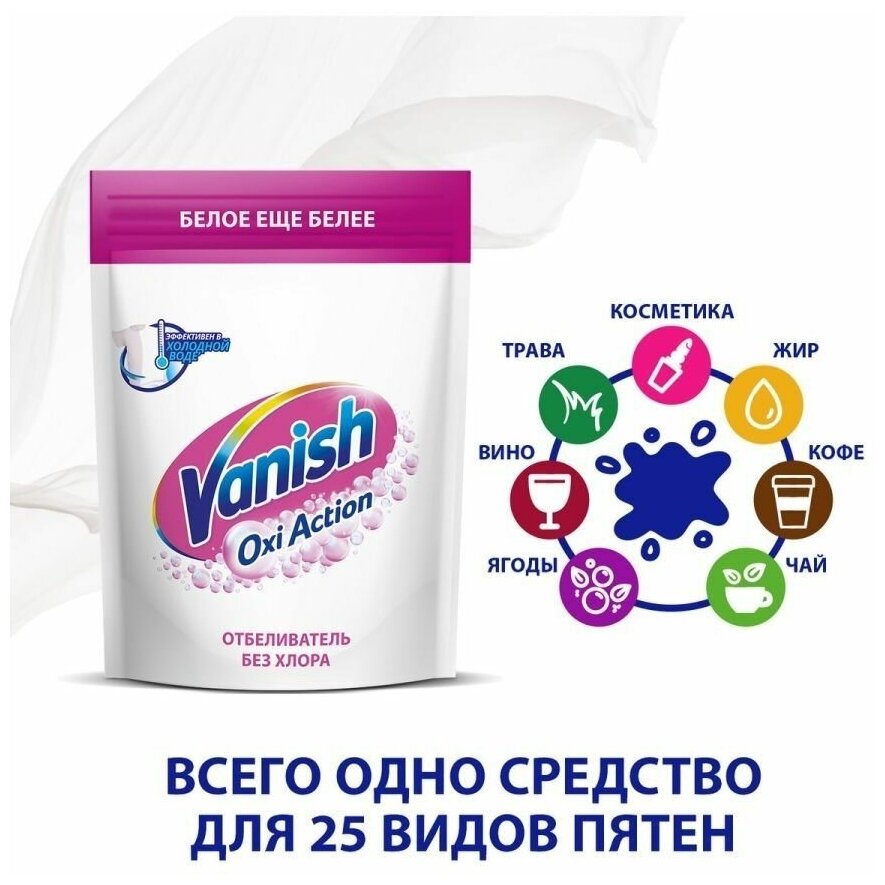 Эффективная формула Oxi Action делает белое еще белее (по сравнению с посеревшей тканью) и обеспечивает эффективное удаление пятен в холодной воде.