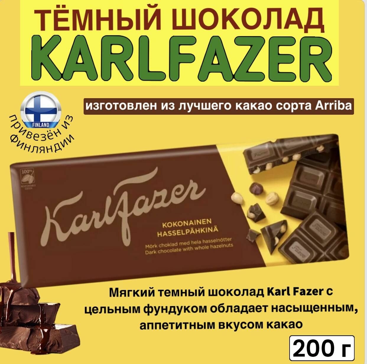 Шоколад Karl Fazer с 1891 года производятся в Финляндии, согласно традициям семьи Fazer, с использованием ингредиентов самого высокого качества. Содержание какао не менее 47%.