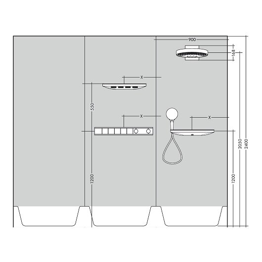 - Термостат с кнопками (ручной душ, PowderRain, водопад, широкая струя Rain и душ для плечевой зоны).