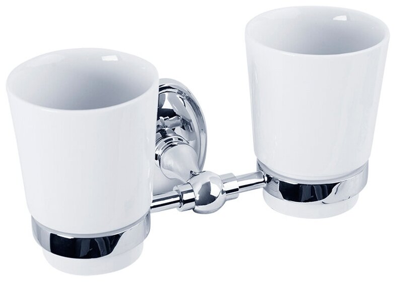Стакан двойной настенный - это очень удобный аксессуар для ванной комнаты, особенно если у вас большая семья. Стакан сделан в классическом стиле и предназначен для хранения зубных щеток и тюбиков с пастой. Также очень удобен для хранения бритвенного станка или средств и кистей для макияжа. Пластиковый уплотнитель надежно фиксирует керамику в креплении, что исключает риск падения стакана. Хромо-никелевое гальваническое покрытие обеспечивает устойчивость к царапинам и придает изделию зеркальный блеск. Материал - латунь.