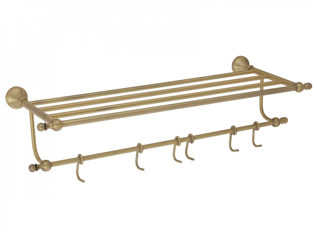 Полка-держатель для полотенец 60 см. с 6-ю подвижными крючками VR. GIL-6426. BR серии GIALETTA — удобный аксессуар для ванной комнаты или сауны. На полке можно хранить свежие полотенца, или прочие предметы одежды. Материал — латунь, покрытие цвета Бронза выполняется методом чернения металла и последующего его зачищения металлическими щетками, что создает красивый эффект состаренного металла.Диаметр розетки, см: 46внимание: покрытие цвета бронзы требует бережного ухода. Разрешается протирать мягкой тряпочкой с мыльным раствором, затем смыть водой и вытереть насухо. Запрещено использование губок и тряпок с грубой поверхностью, любых моющих средств, кроме средств специально предназначенных для ухода за покрытием цвета бронза.