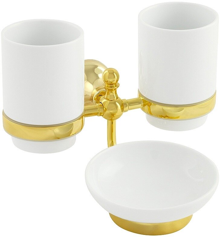 Стакан двойной настенный с мыльницей VR.GIL-6443.DO серии GIALETTA — придуман для небольших ванных комнат. Он позволяет сэкономить место без ущерба функциональности. Белая керамика высокого качества и ее легко мыть. Между каждым керамическим предметом и латунным кольцом имеется уплотнительная прокладка, благодаря которой керамика надежно фиксируется на своем месте. Материал: латунь. Гальваническое покрытие с использованием золота 24 карата с защитным прозрачным покрытием лаком сверху.