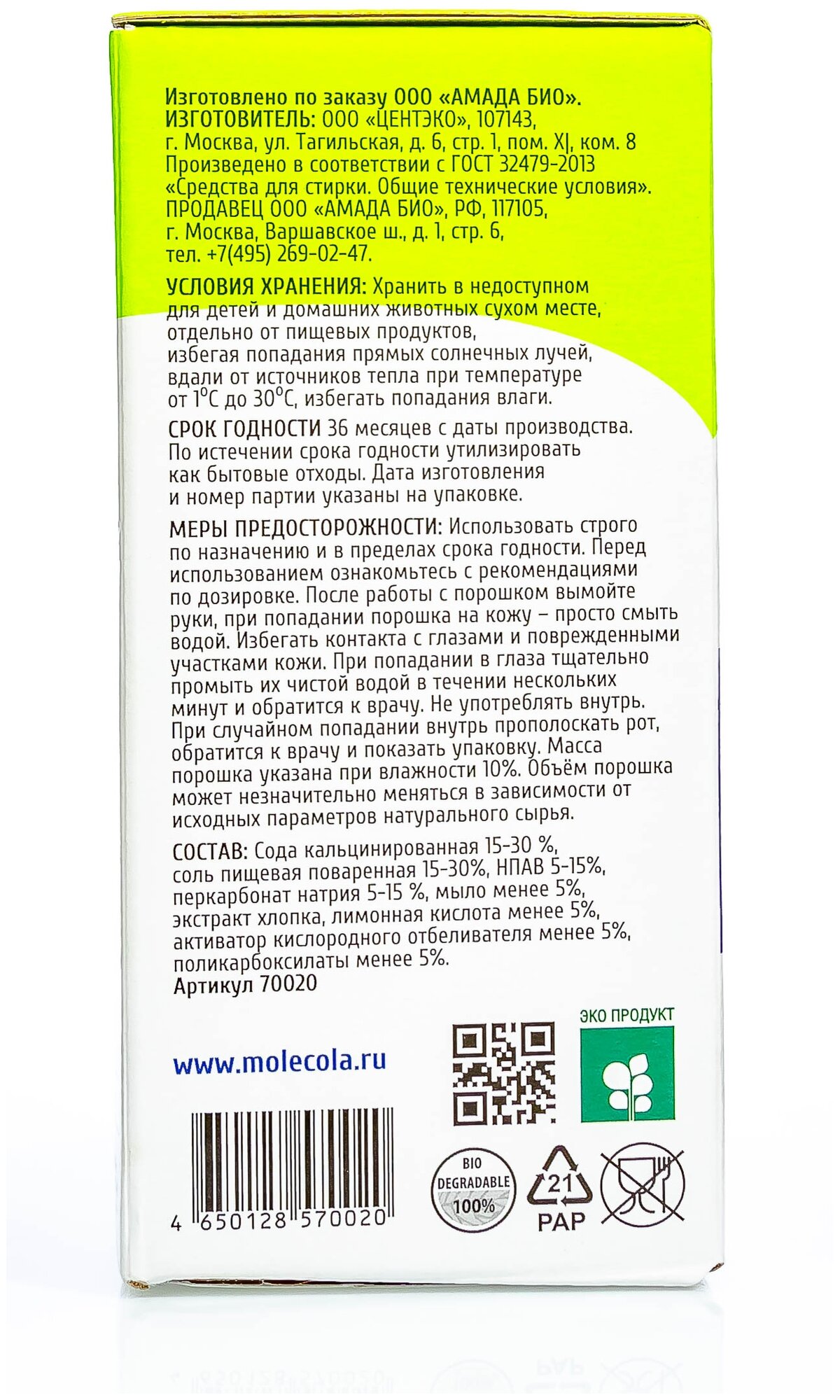 | Состав | Сода кальцинированная 15-30%, соль пищевая поваренная 15-30%, НПАВ 5-15%, перкарбонат натрия 5-15%, мыло менее 5%, экстракт хлопка, лимонная кислота менее 5%, активатор кислородного отбеливателя менее 5%, поликарбоксилаты менее 5%. |