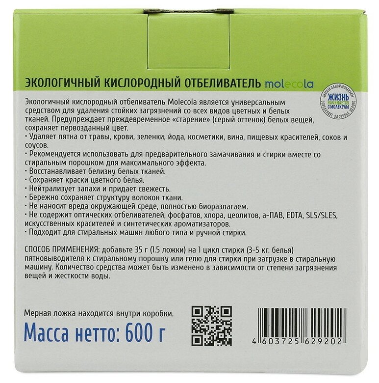 Экологичный кислородный отбеливатель Molecola® является универсальным средством для удаления стойких загрязнений со всех видов цветных и белых тканей. Предупреждает преждевременное «старение» (серый оттенок) белых вещей, сохраняет первозданный цвет. Рекомендуется использовать для предварительного замачивания и стирки вместе со стиральным порошком для максимального эффекта.