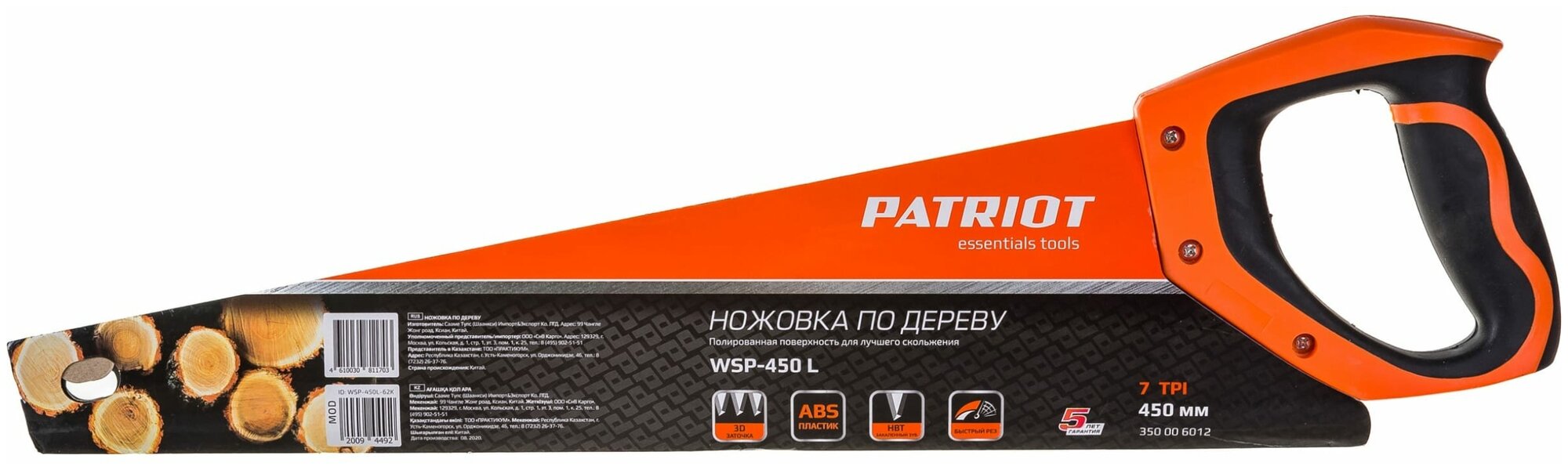 Ножовка по дереву Patriot 350006012 WSP-450L 7 TPI крупный зуб, 3-х сторонняя заточка, 450мм