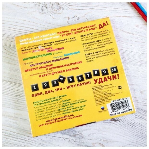 Вместо лирики и двусмысленности слов — четкие, совершенные, безупречные цифры: таков девиз нового «Эрудита: десять в ряд». Кажется, что может быть проще, чем расставить числа в одно за другим по возрастанию — но все меняется, когда приходят соперники, так и норовящие помешать вашему ряду, а учитывать приходится так много: и конкурирующие ряды, и бонусные позиции и даже странные значки, вроде «больше», «меньше» или «равно».