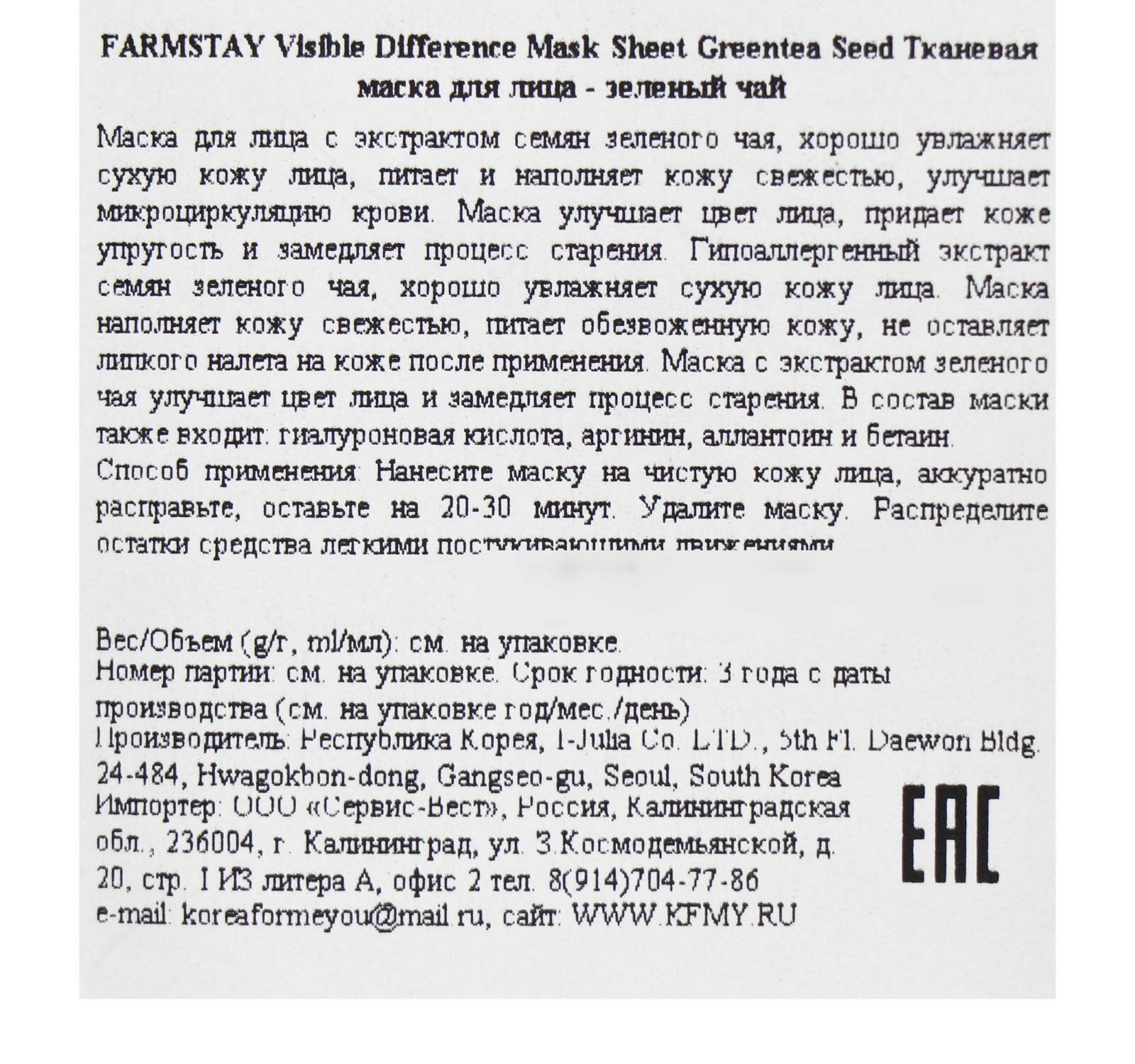 Маска для лица FarmStay тканевая с экстрактом семян зеленого чая 23мл Sindo P&G
