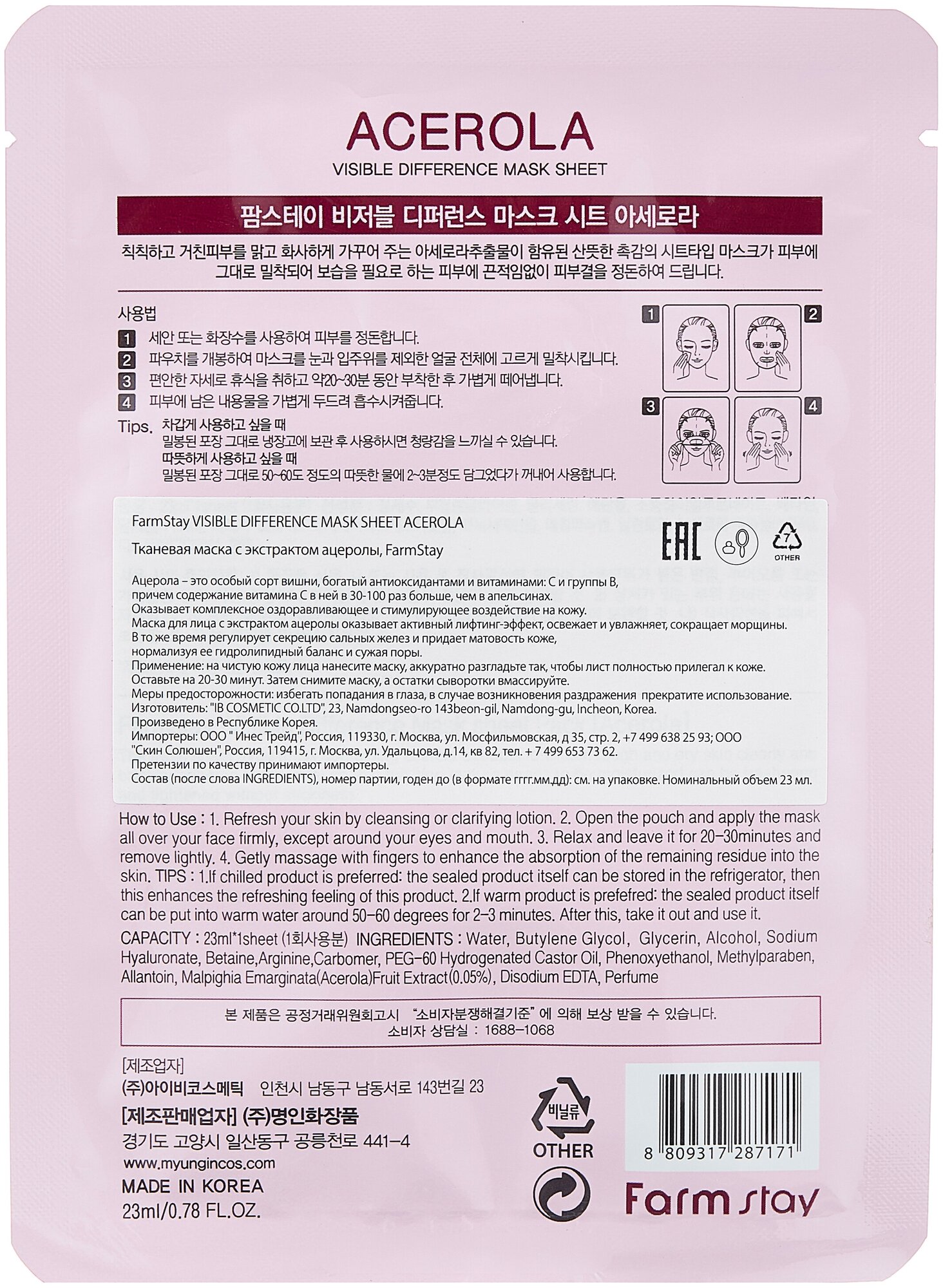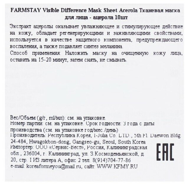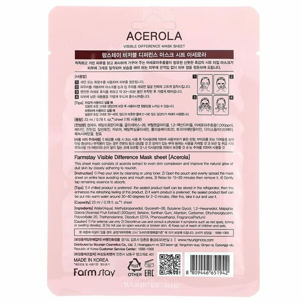 Маска для лица с экстрактом ацеролы оказывает активный лифтинг и антиоксидантный эффект, освежает и увлажняет, уменьшает глубину морщин, сужает поры. Маска для лица с экстрактом ацеролы Visible Difference Mask Sheet Acerola регулирует секрецию сальных желез и придает матовость коже, нормализуя ее баланс. Экстракт ацеролы оказывает активный лифтинг и антиоксидантный эффект. Содержание витамина С в ацероле превышает в 30-100 раз содержание витамина С в апельсинах, богат витаминами группы В. Обладает увлажняющим и стимулирующим действием на кожу.