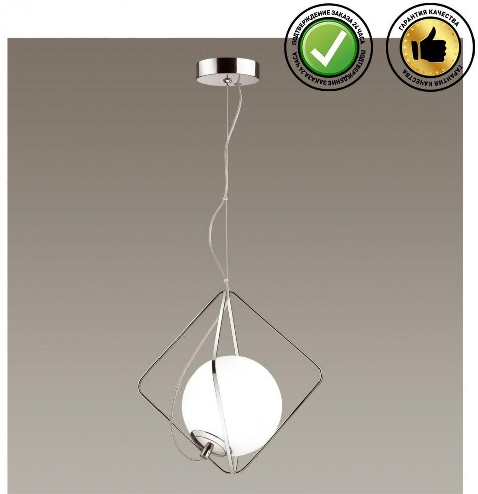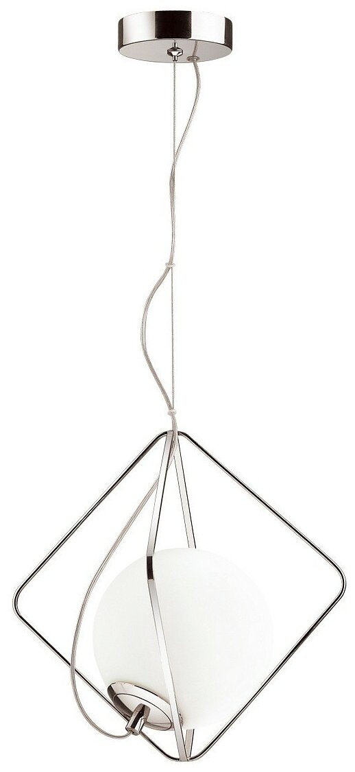 Подвесной светильник – образец современного функционального минимализма. Модель имеет четкую геометрическую структуру: две квадратные рамки из хромированного металла образуют условный куб, в который вписан шар-плафон. Создание композиции из стеклянной сферы и металлической конструкции достигается без видимых соединительных элементов. Монохромность и лаконичность форм компенсируются выразительным контрастом белого матового стекла и глянцевой поверхности арматуры.