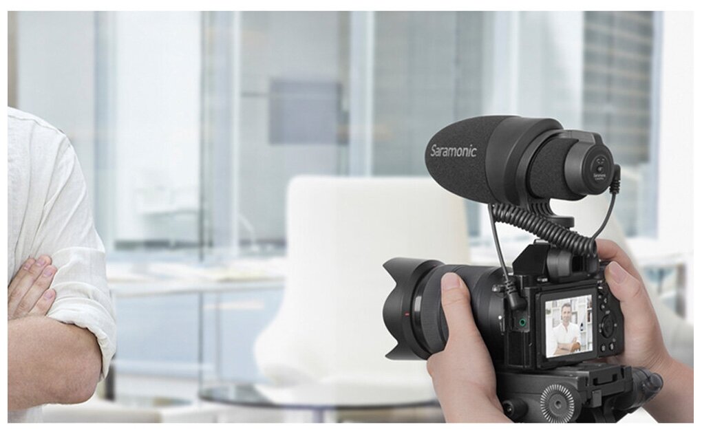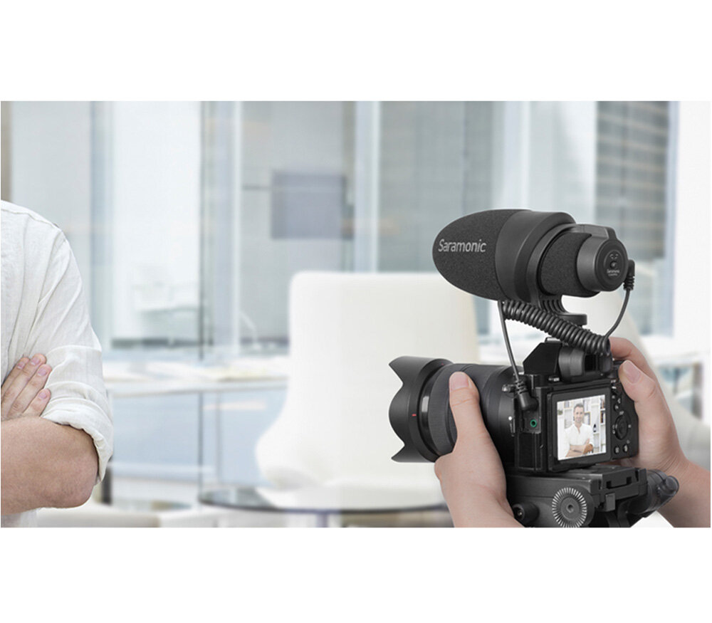 Компактный накамерный микрофон-пушка Saramonic CamMic с направленным подбором позволяет избавиться от большей части посторонних звуков при записи видео. Чтобы устранить низкий гул от систем кондиционирования, офисной техники, дорожного движения, можно включить фильтр высоких частот, отсекающий волны ниже 80 Гц. В дизайне корпуса предусмотрено антишоковое крепление, которое не пропускает вибрации и стуки от корпуса камеры к капсюлю. Микрофон не требует внешнего питания, ему достаточно низковольтного питания от микрофонного входа («plug-in power»). Перед покупкой уточните, подает ли ваша камера питание на микрофонный вход, или она работает только с микрофонами, имеющими собственный источник питания. Во втором случае Saramonic CamMic будет несовместим с вашей камерой.Микрофонный кабель является съемным, вы можете заменить его на более длинный при необходимости (или в случае повреждения кабеля). В комплекте идут два кабеля: 3.5 мм TRS – для фотоаппаратов, видеокамер, аудиорекордеров, и 3.5 мм TRRS – гарнитурный вход телефонов, планшетов, ноутбуков. Также можно использовать переходники на другие разъемы: например, Saramonic LC-C35 на Lightning, для подключения к телефонам Apple.Крепление: в башмак камеры + резьба 3/8".