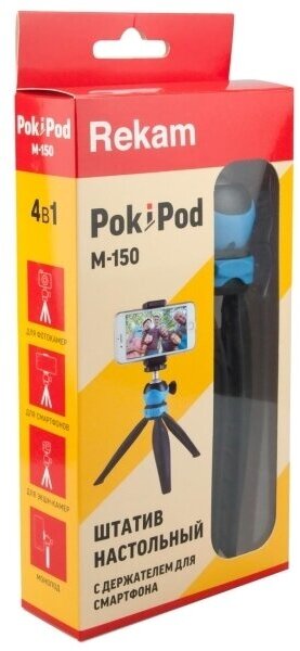 | Дополнительно * | Rekam Pokipod M-150 – компактный настольный штатив для фиксации смартфонов и компактных фотоаппаратов. Устройство можно использовать в качестве подставки для чтения и общения или миниатюрной селфи-палки. |