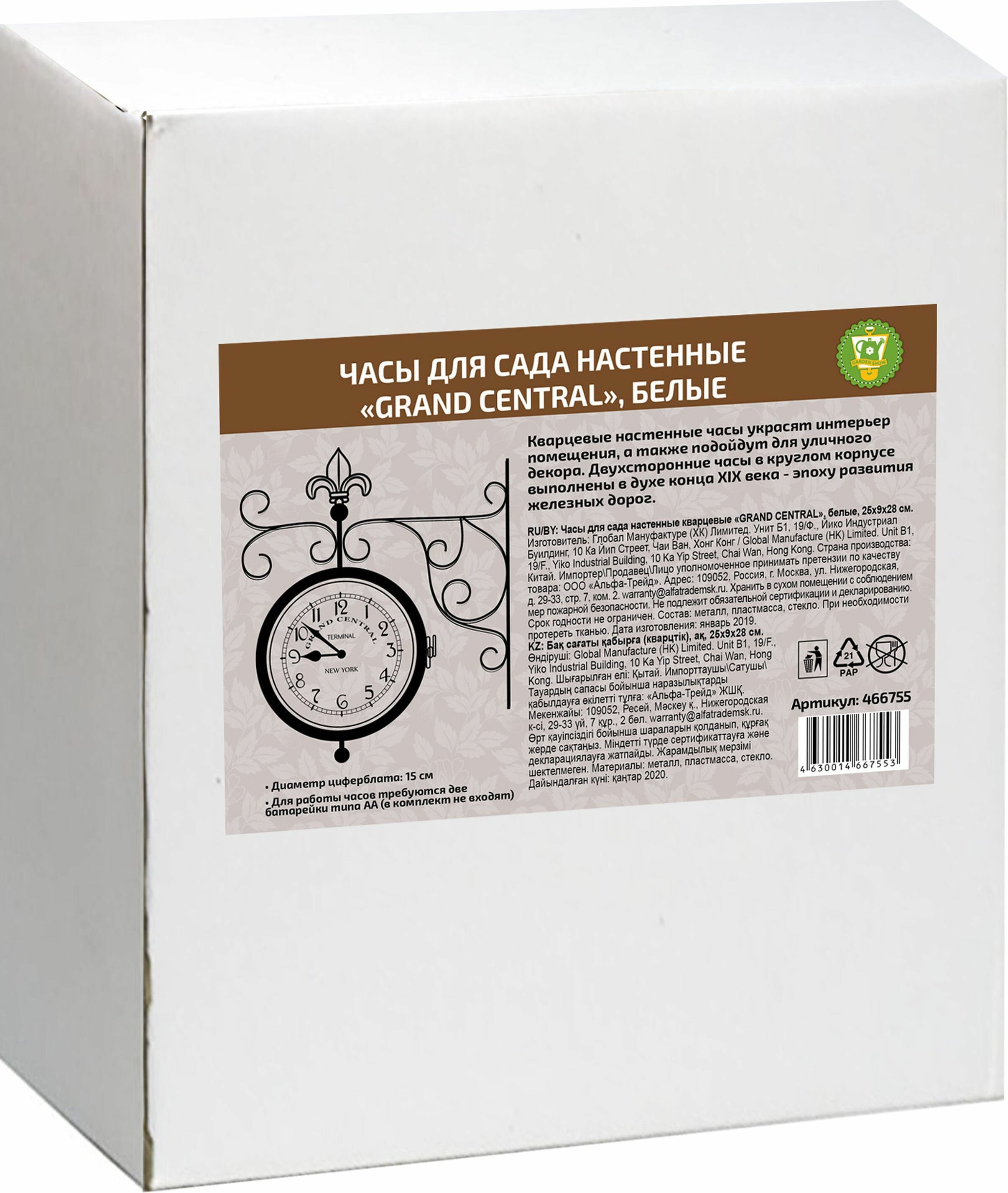 Кварцевые часы для сада станут замечательным дизайнерским решением для декора сада, дачи или гостиной дома. Часы оформлены арабскими цифрами и имеют две стрелки - часовую и минутную. Циферблат оформлен надписью: Grand Central Terminal. New York. Часы крепятся к стене с помощью кронштейна. Для работы часов требуются две батарейки типа АА (в комплект не входят).
