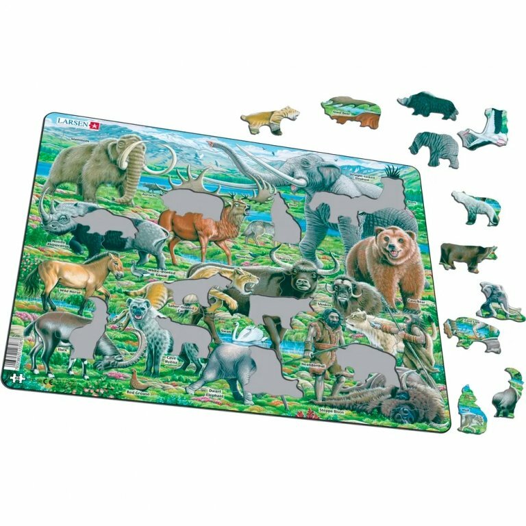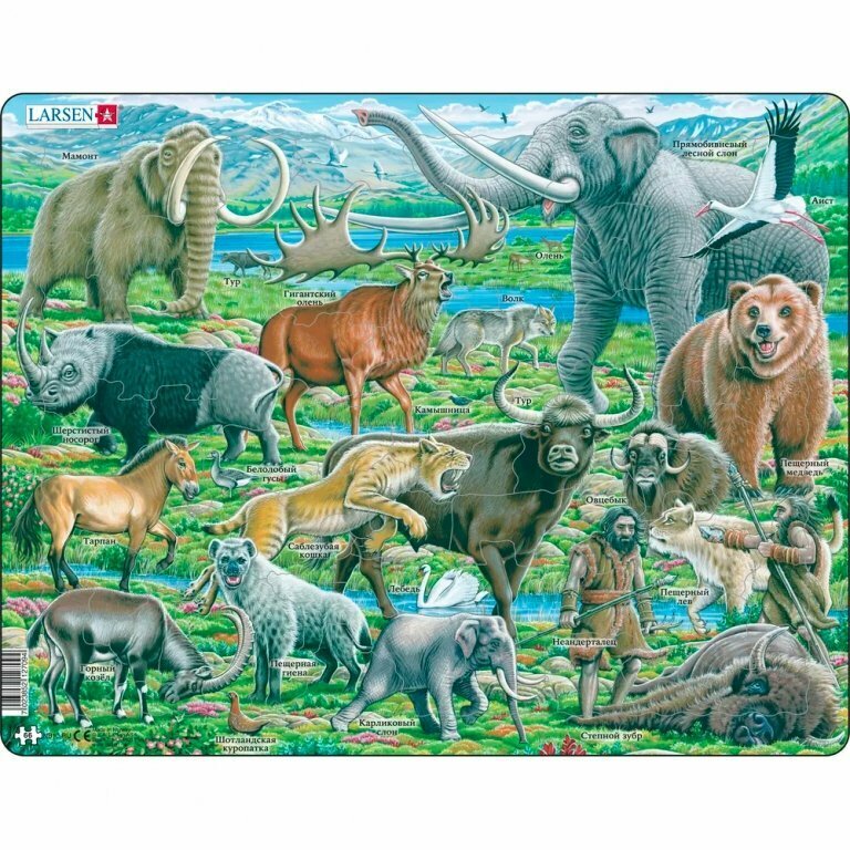 На собранном пазле ребенок сможет увидеть длиннохвостого мамонта, слона, саблезубого кота, волка, льва, лошадь, бурого пещерного медведя, гигантского оленя, белолобого гуся, пещерную гиену, горного козла, аист и степной бизон. Именно эти животные населяли землю во время существования неандертальца.