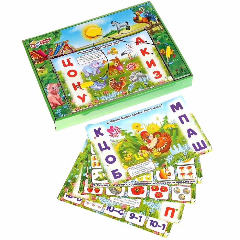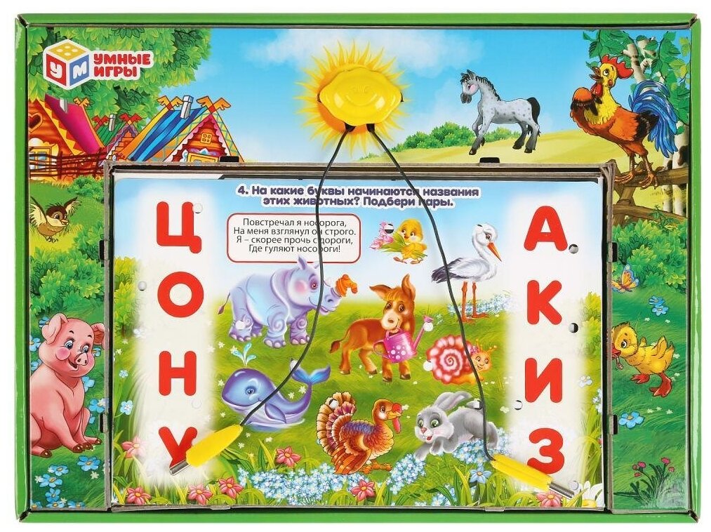 В игре использованы замечательные стихи М. Дружининой и более 100 красочных картинок с 12 заданиями. На карточках изображены яркие буквы, цифры, животные и предметы. Световой сигнал всегда подскажет правильный ответ! Вы можете задавать ребёнку дополнительные вопросы. Например, «Сколько всего букв на карточке?», «Кто нарисован под чайкой?» и т. д. Желаем успешного обучения!