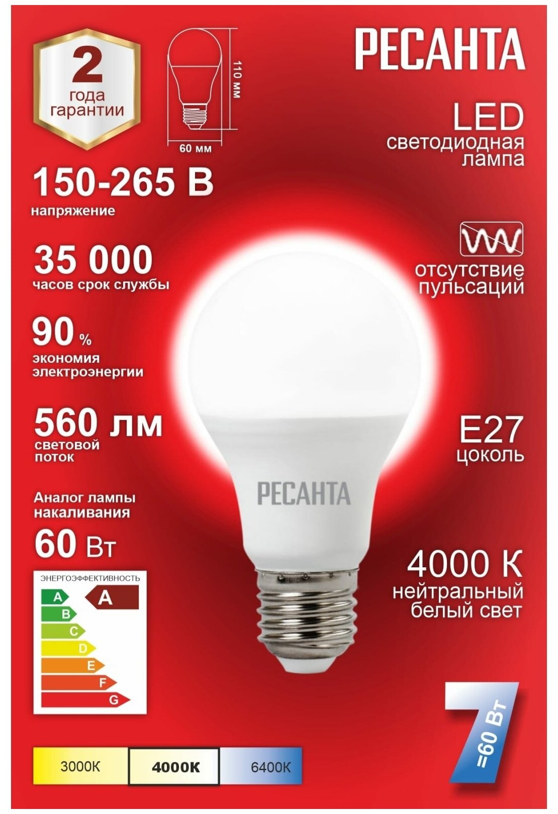 Светодиодная лампа Ресанта LL-R-A60-7W-230-4K-E27
