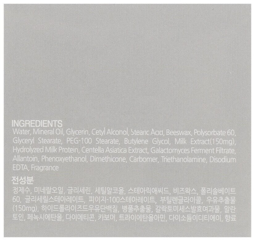 | Состав | Water, Mineral Oil, Glycerin, Cetyl Alcohol, Stearic Acid, Beeswax, Polysorbate 60, Glyceryl Stearate, PEG-100 Stearate, Butylene Glycol, Milk Extract(150 mg), Hydrolyzed Milk Protein, Centella Asiatica Extract, Galactomyces Ferment Filtrate, Allantoin, Phenoxyethanol, Dimethicone, Carbomer, Triethanolamine, Disodiurn EDTA, Fragrance |