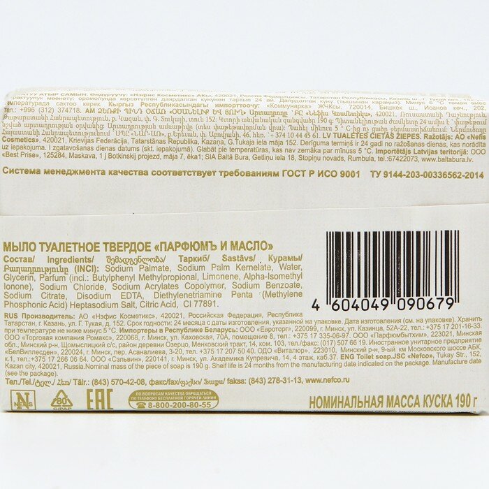 Описание товара:Роскошное мыло с запоминающимся ароматом и увеличенным содержанием ухаживающих масел подарит Вашей коже мягкость и приятные ощущения от каждого использования.Состав товара:Натриевые соли натуральных жирных кислот, вода, глицерин, парфюмерная композиция (в т.ч. бутилфенилметилпропионал, цитронеллол, лимонен, гексилциннамал, гераниол, альфа-изометилионол, эвгенол), стабилизатор, пластификатор, натриевые соли этилендиаминтетрауксусной кислоты, лимонная кислота, хлорид натрия, CI 77891.Меры предосторожности:Хранить в сухих, закрытых, хорошо проветриваемых помещениях при температуре не ниже минус 5°С и относительной влажности воздуха не более 75%.Способ применения:Предназначено для гигиенических целей, необходимое количество вспенить на ладони и нанести на руки или тело, массажными движениями снять загрязнения, смыть мыло под проточной водой.